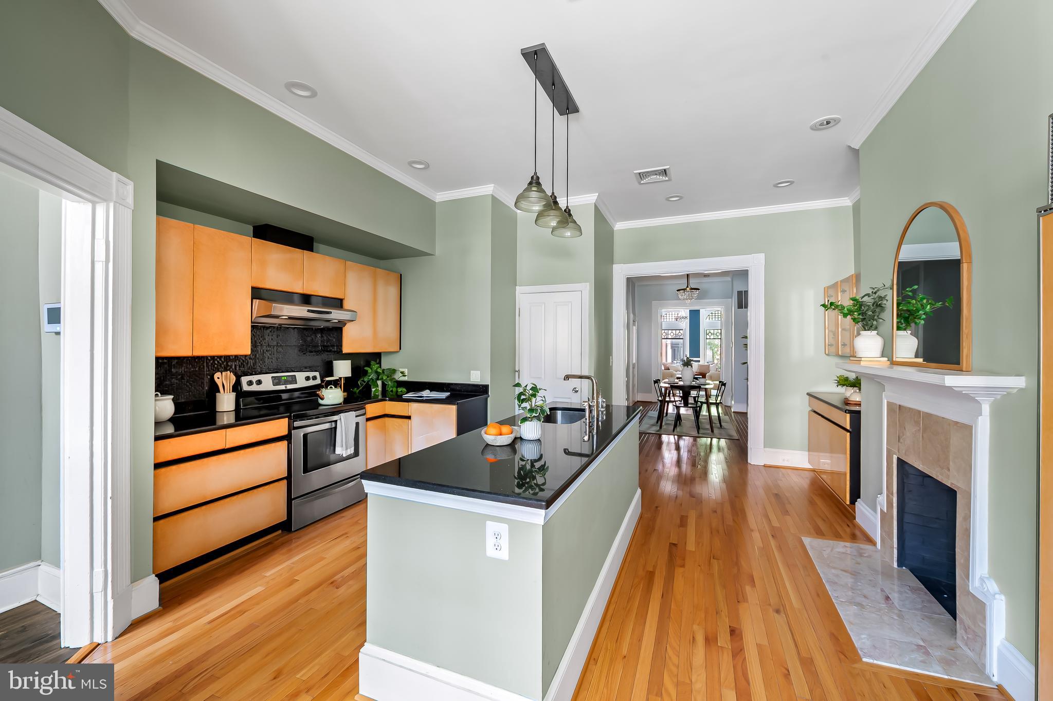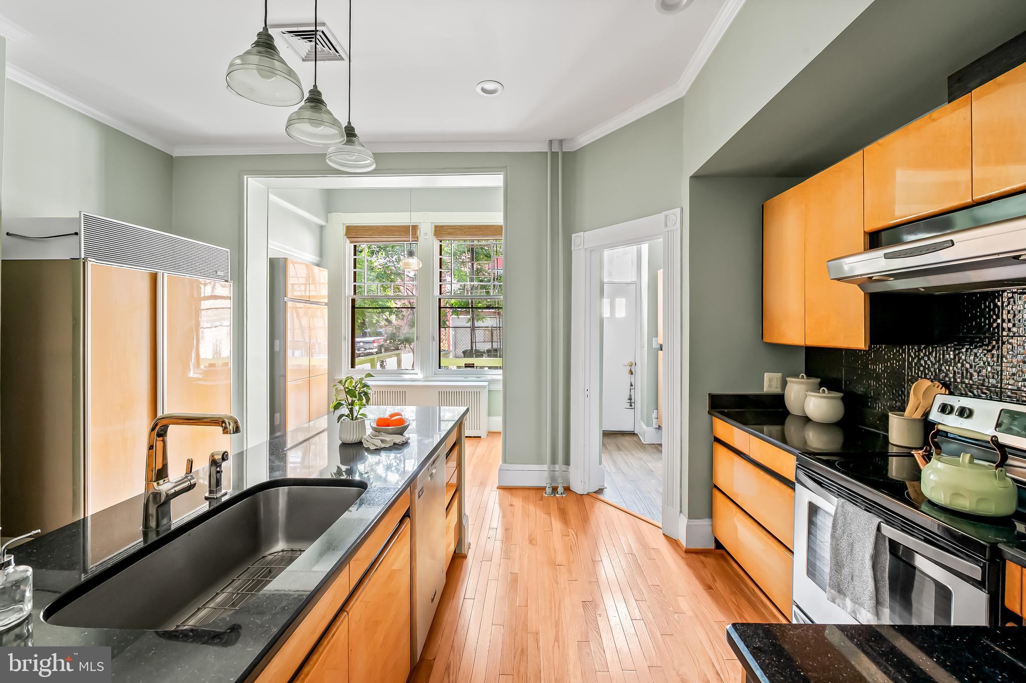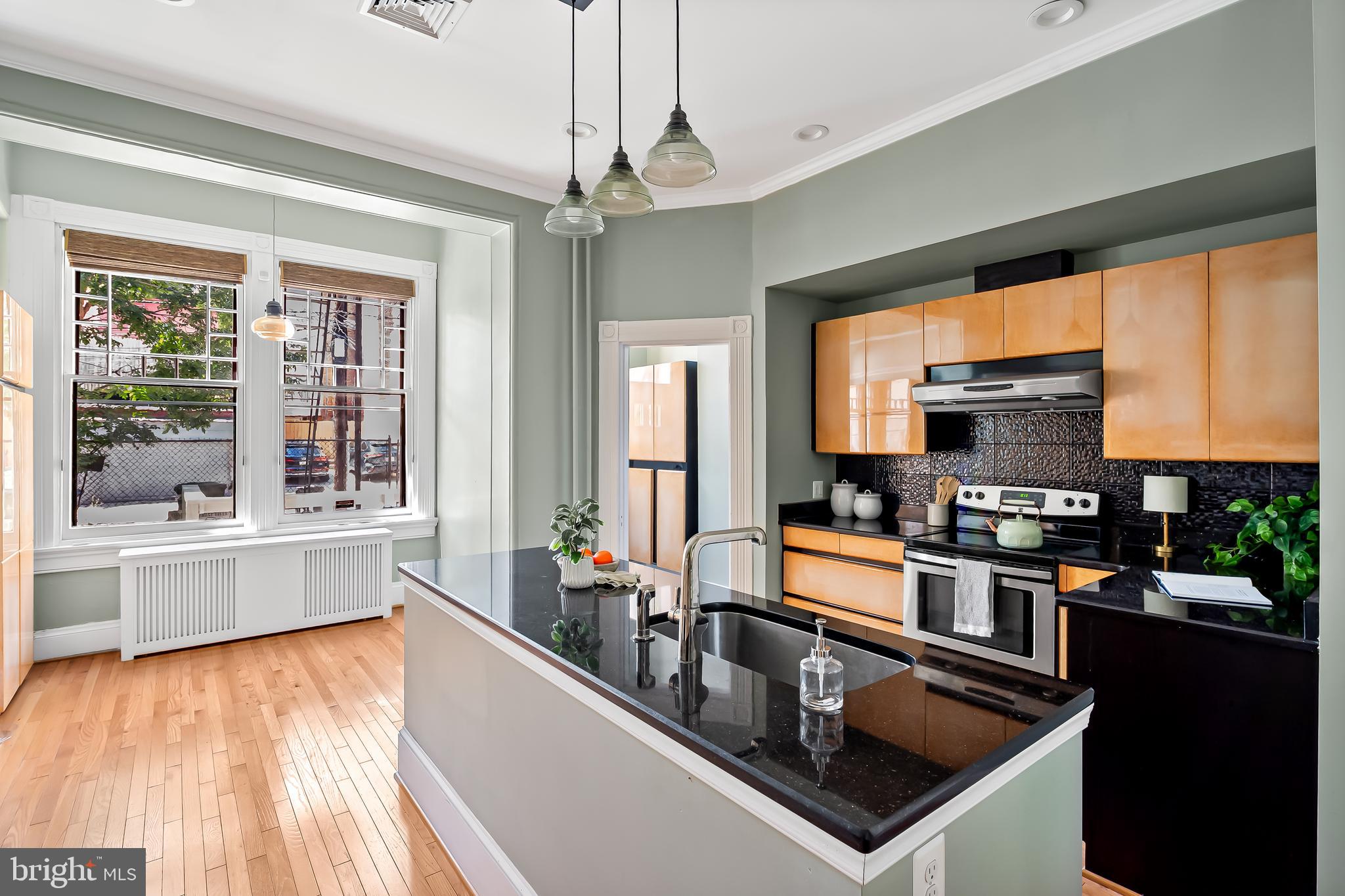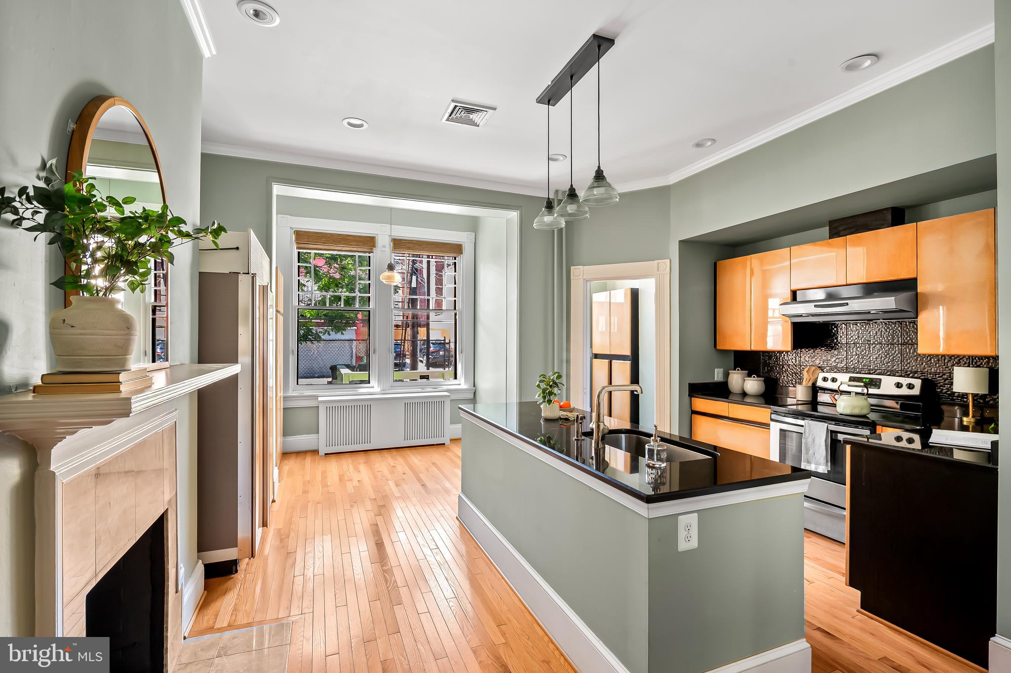 At 1040 N Calvert, you experience that legacy the moment you step inside. Soaring ceilings, intricate woodwork, and tall windows recall the grandeur of a bygone era, while thoughtful updates provide the comfort and flexibility of modern living. The double living room is as suited to hosting salons and gatherings as it is to curling up with a book, reflecting the tradition of entertaining and intellectual exchange that Mount Vernon is known for.