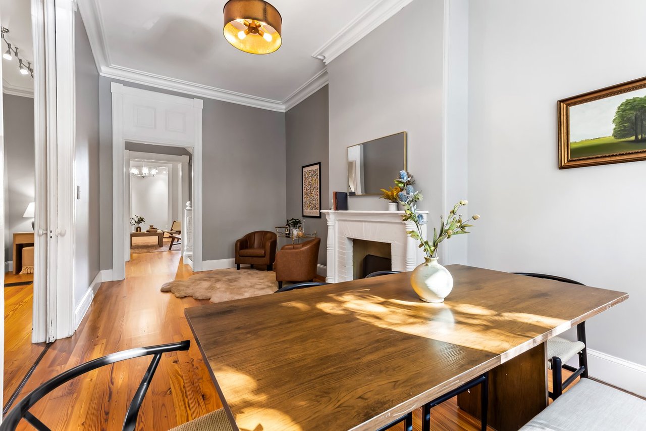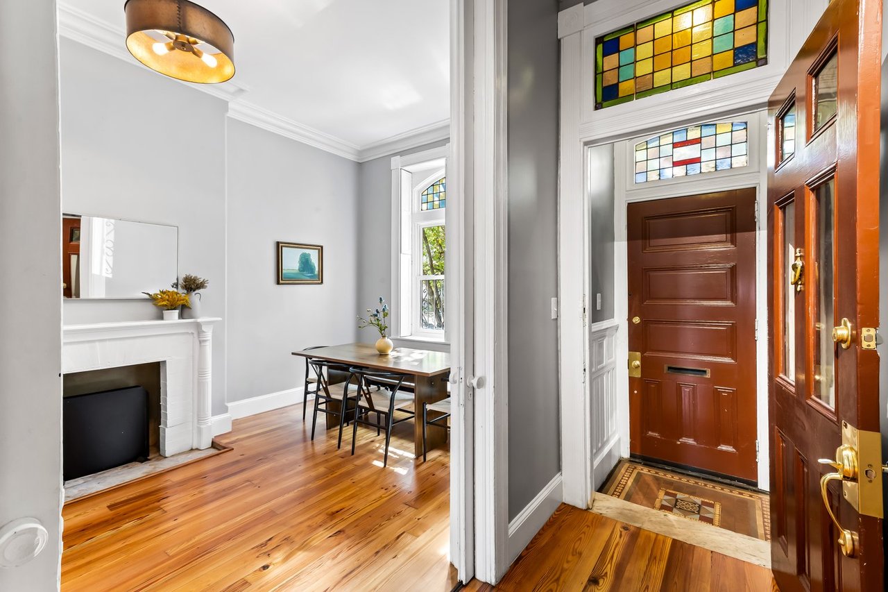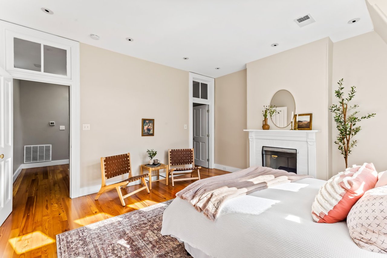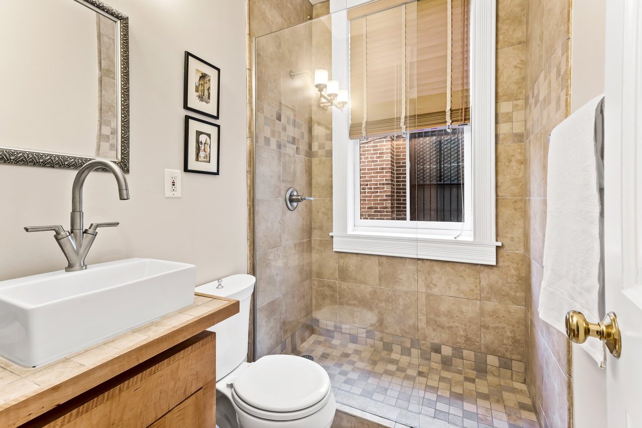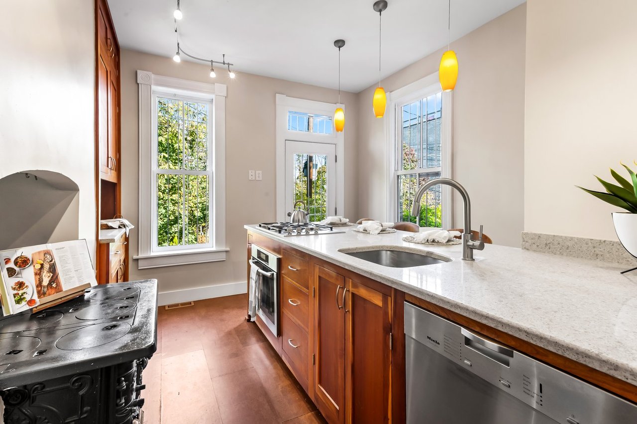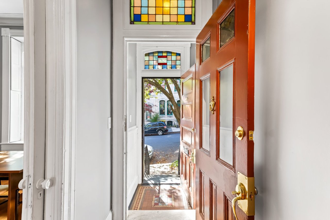 Circa 1881, this beautiful row of dormered Eastlake style townhouses were built on this dead end block of John St in Bolton Hill. So many original details remain including six original mantels, one wood burning fireplace, stained glass, ornate staircase, rear servants staircase and the original coal stove in the kitchen. 1213 John Street is one of the few fully restored homes in Bolton Hill with new historically accurate wood windows and heart pine wood floors, all new wiring, plumbing, two zone heat and cool, roof, kitchen and baths and more!. The main level has a living room, dining room, powder room and beautiful modern eat-in-kitchen with bar seating. The second floor has three bedrooms and one full bath. The third floor was used as a primary suite with a walk-in-closet with Bosch washer/dryer combo, cedar closet, primary spa bath with walk-in shower and soaking tub along with a fifth bedroom which would be an excellent home office, nursery or home gym. The basement is unfinished and has a brand new concrete floor, new electric hot water heater, and additional washer/dryer. Perfect basement for storage only. The home has a wonderful, low maintenance bluestone patio for entertaining which is easily accessible directly from the kitchen. Located in the beautiful tree-lined neighborhood in Bolton Hill with easy street permit parking. This home is conveniently close to Penn Station, making it easy to access the MARC Train to Washington D.C., Amtrak to Philadelphia or NYC, and the Hopkins Shuttle to the Homewood or East Baltimore Campus. The property also offers easy access to the Light Rail for travel to BWI Airport, as well as major highways such as I-95, I-295, and I-83. For those on two, or four feet, or two wheels, the home is located in a very walkable neighborhood with many bike lanes to connect you to all parts of the city. Bolton Hill is known for its beautiful tree-lined streets, welcoming community, and proximity to local restaurants, cafes, and local shopping opportunities. Your new neighbors are awaiting your arrival to this special block. This home is located in a CHAP Historic District and is subject to the Midtown Special Benefits District Surcharge Tax