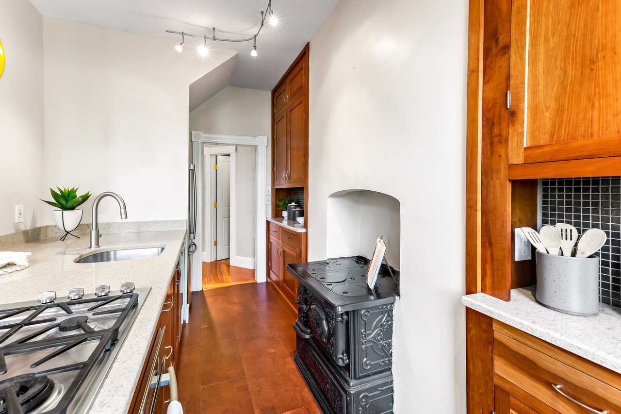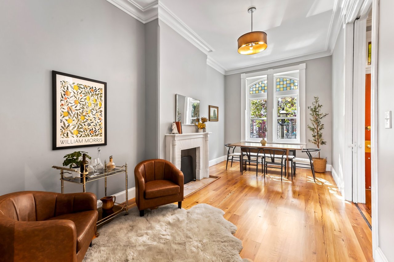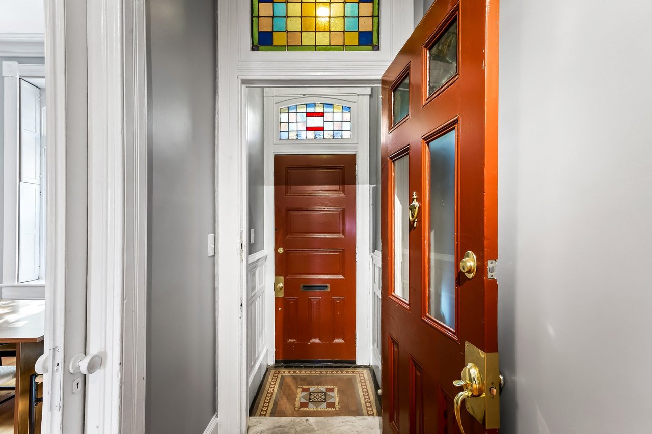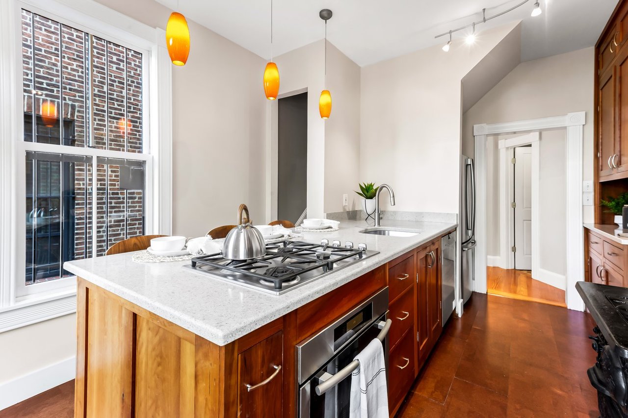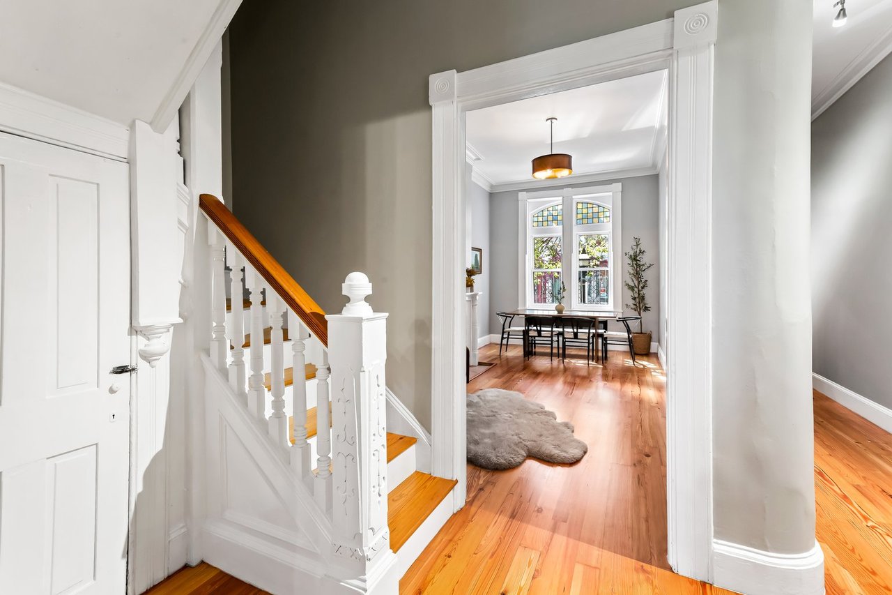 Circa 1881, this beautiful row of dormered Eastlake style townhouses were built on this dead end block of John St in Bolton Hill. So many original details remain including six original mantels, one wood burning fireplace, stained glass, ornate staircase, rear servants staircase and the original coal stove in the kitchen. 1213 John Street is one of the few fully restored homes in Bolton Hill with new historically accurate wood windows and heart pine wood floors, all new wiring, plumbing, two zone heat and cool, roof, kitchen and baths and more!. The main level has a living room, dining room, powder room and beautiful modern eat-in-kitchen with bar seating. The second floor has three bedrooms and one full bath. The third floor was used as a primary suite with a walk-in-closet with Bosch washer/dryer combo, cedar closet, primary spa bath with walk-in shower and soaking tub along with a fifth bedroom which would be an excellent home office, nursery or home gym. The basement is unfinished and has a brand new concrete floor, new electric hot water heater, and additional washer/dryer. Perfect basement for storage only. The home has a wonderful, low maintenance bluestone patio for entertaining which is easily accessible directly from the kitchen. Located in the beautiful tree-lined neighborhood in Bolton Hill with easy street permit parking. This home is conveniently close to Penn Station, making it easy to access the MARC Train to Washington D.C., Amtrak to Philadelphia or NYC, and the Hopkins Shuttle to the Homewood or East Baltimore Campus. The property also offers easy access to the Light Rail for travel to BWI Airport, as well as major highways such as I-95, I-295, and I-83. For those on two, or four feet, or two wheels, the home is located in a very walkable neighborhood with many bike lanes to connect you to all parts of the city. Bolton Hill is known for its beautiful tree-lined streets, welcoming community, and proximity to local restaurants, cafes, and local shopping opportunities. Your new neighbors are awaiting your arrival to this special block. This home is located in a CHAP Historic District and is subject to the Midtown Special Benefits District Surcharge Tax