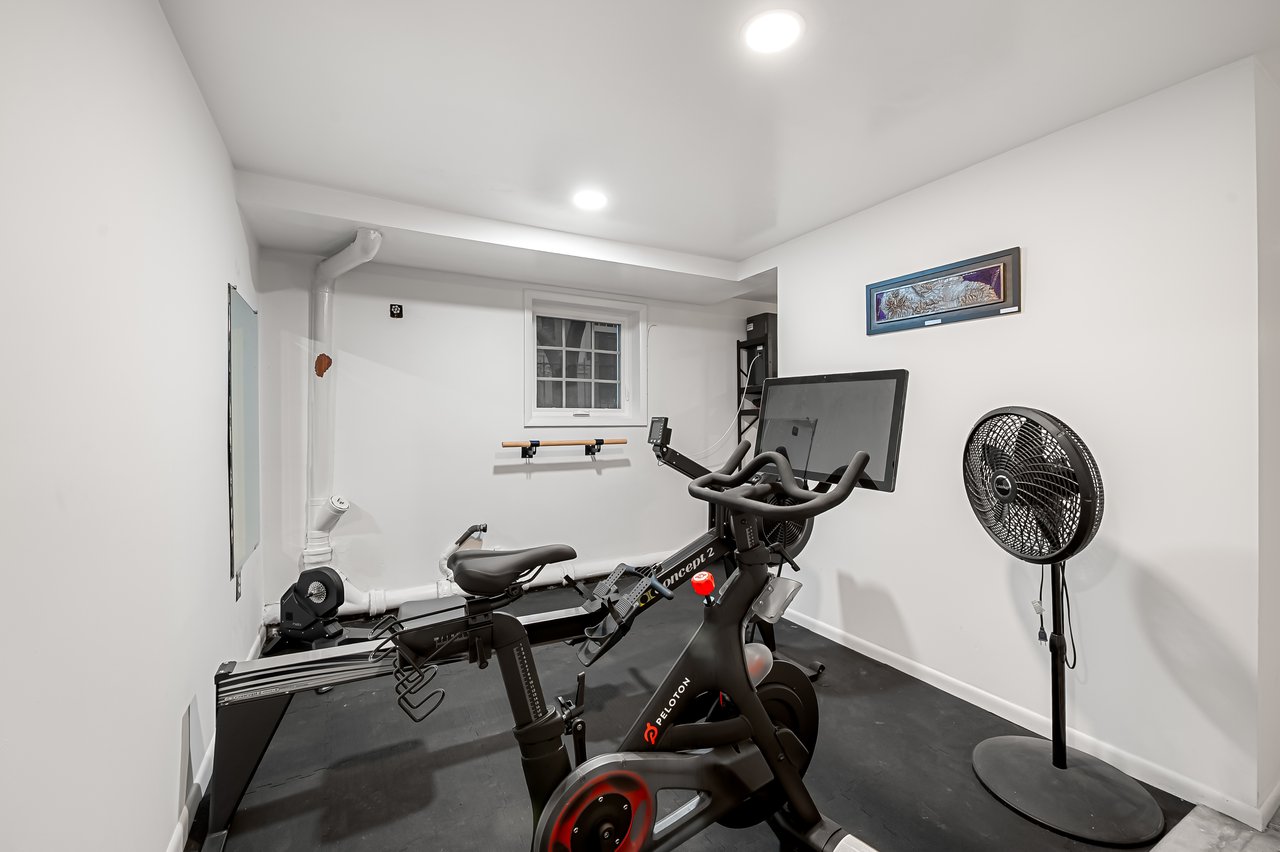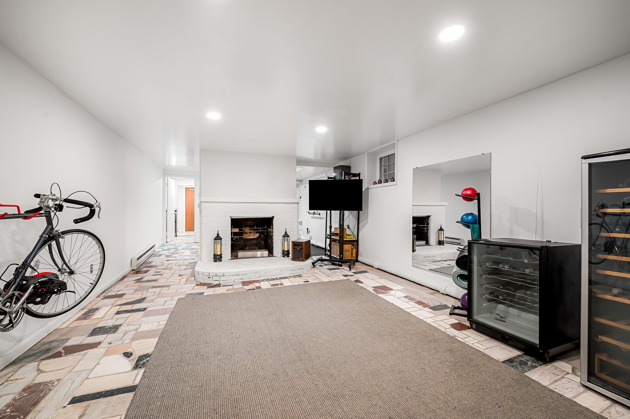 The lower level is currently being used for a home gym, wine cellar, storage, laundry, and workshop.