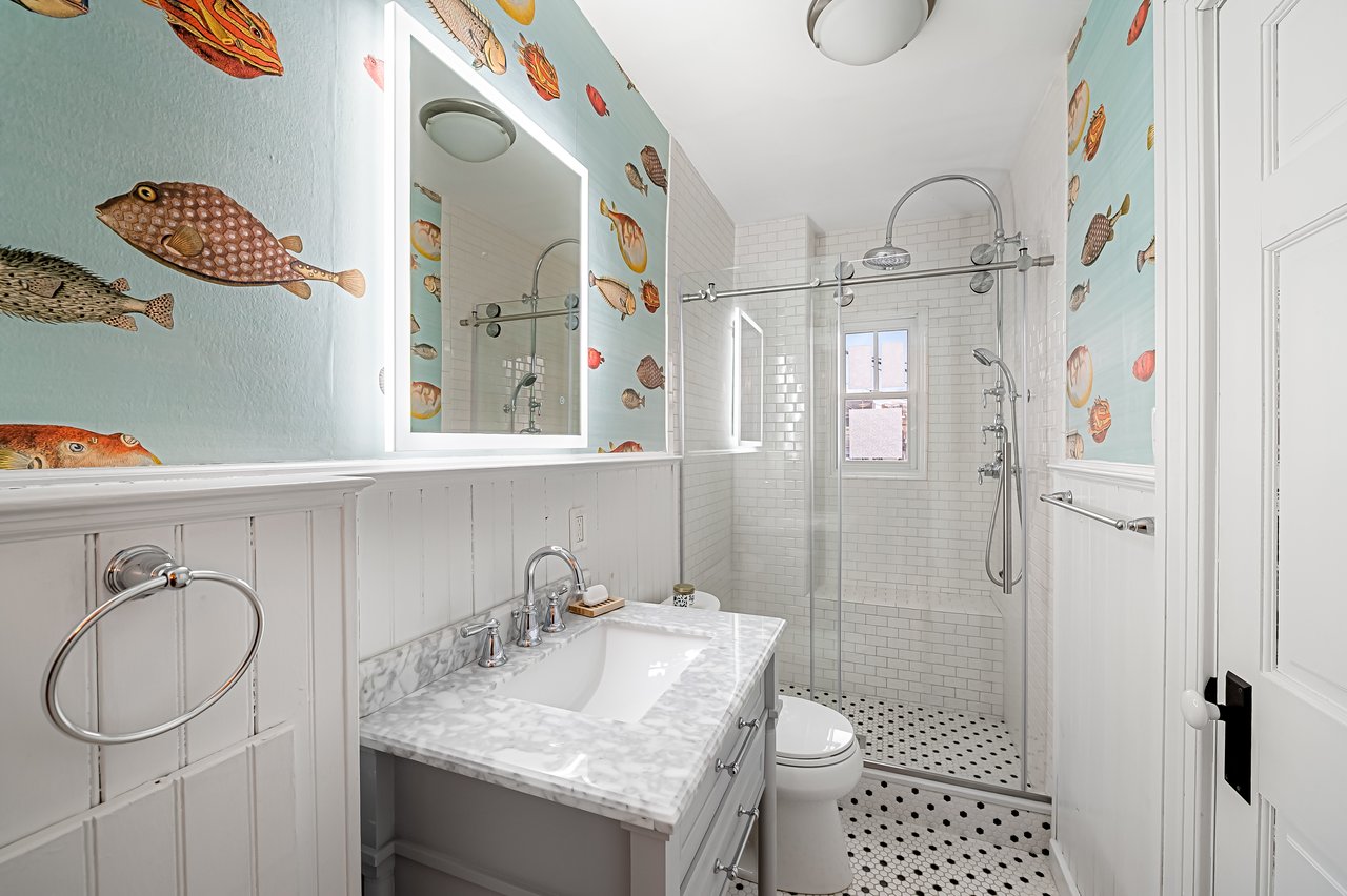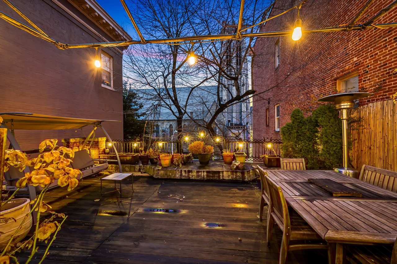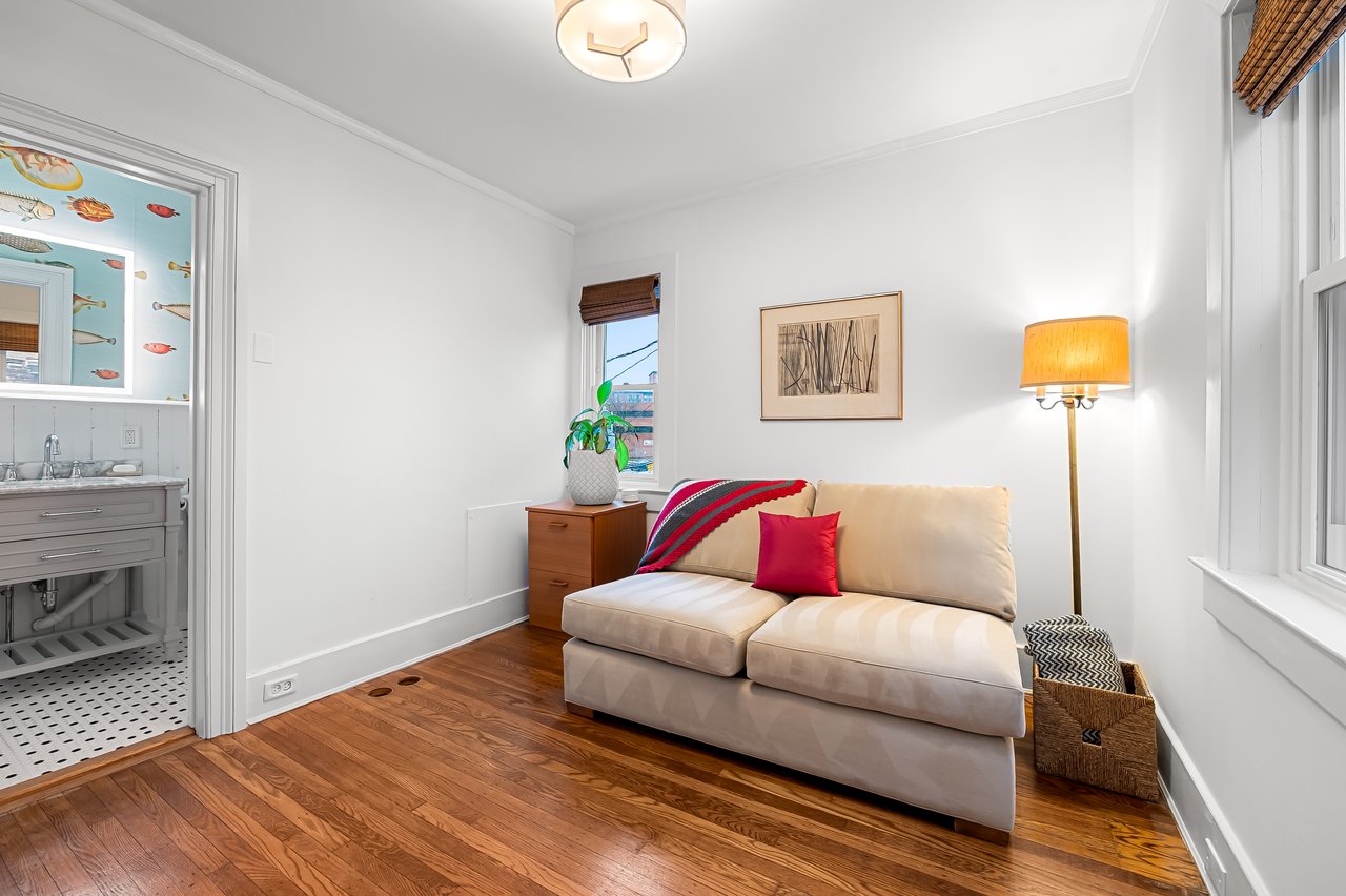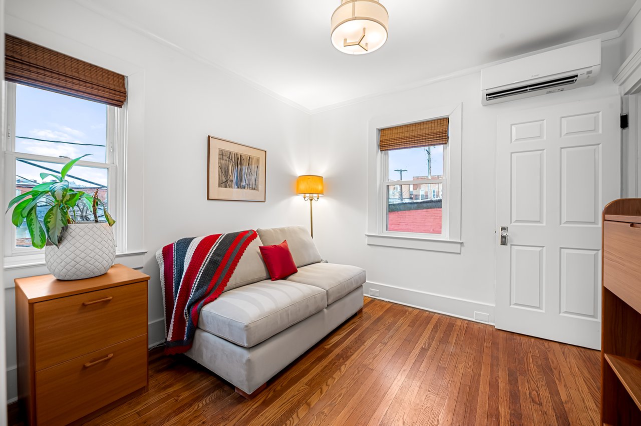 A beautifully proportioned dining room sits adjacent to the kitchen and opens onto a private roof terrace. This secluded outdoor space offers a rare opportunity for al fresco dining, evening gatherings, or quiet mornings above the surrounding cityscape. At the rear of the second floor is an additional bedroom or study along with a newly renovated full bath featuring a walk-in shower and curated finishes.