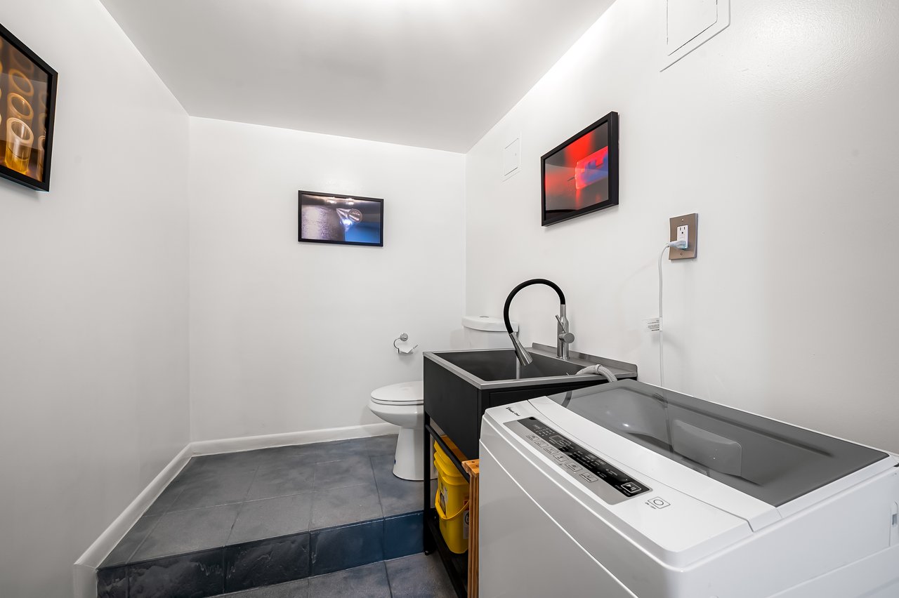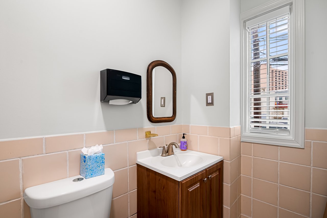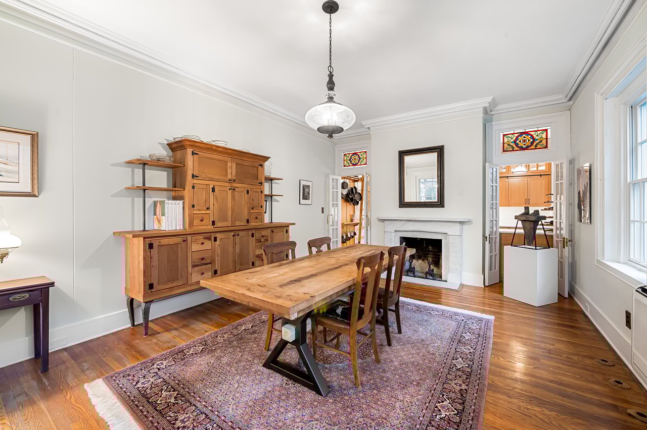 A distinguished double mahogany entrance opens into a grand flagstone reception hall that immediately establishes the home’s sense of architectural presence. The entire ground level functions as a self contained suite with three generous rooms, two powder rooms, and a well appointed galley kitchen. The current owner operates their business from this level and leases the office space back to themselves, an elegant and efficient use of the home’s rare residential and office zoning.