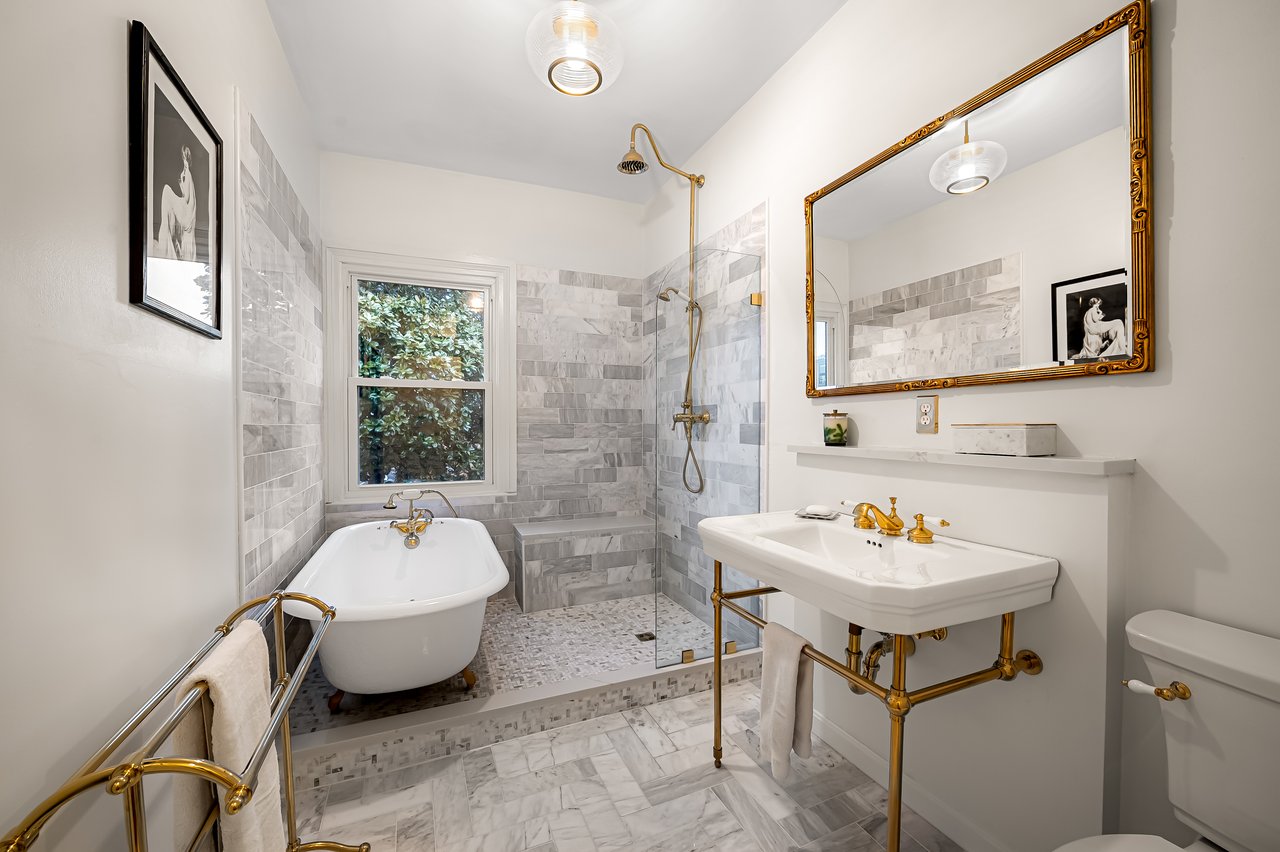 The third floor continues the home’s elegant arrangement of private spaces. A generous primary suite occupies the front of the house and includes a spacious ensuite bath. At the rear of this level is an additional bedroom accompanied by a beautifully curated bath featuring a walk-in shower, a restored clawfoot soaking tub, marble tile, and bespoke brass fixtures.