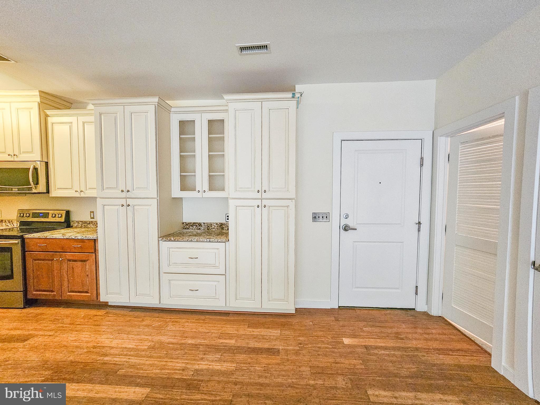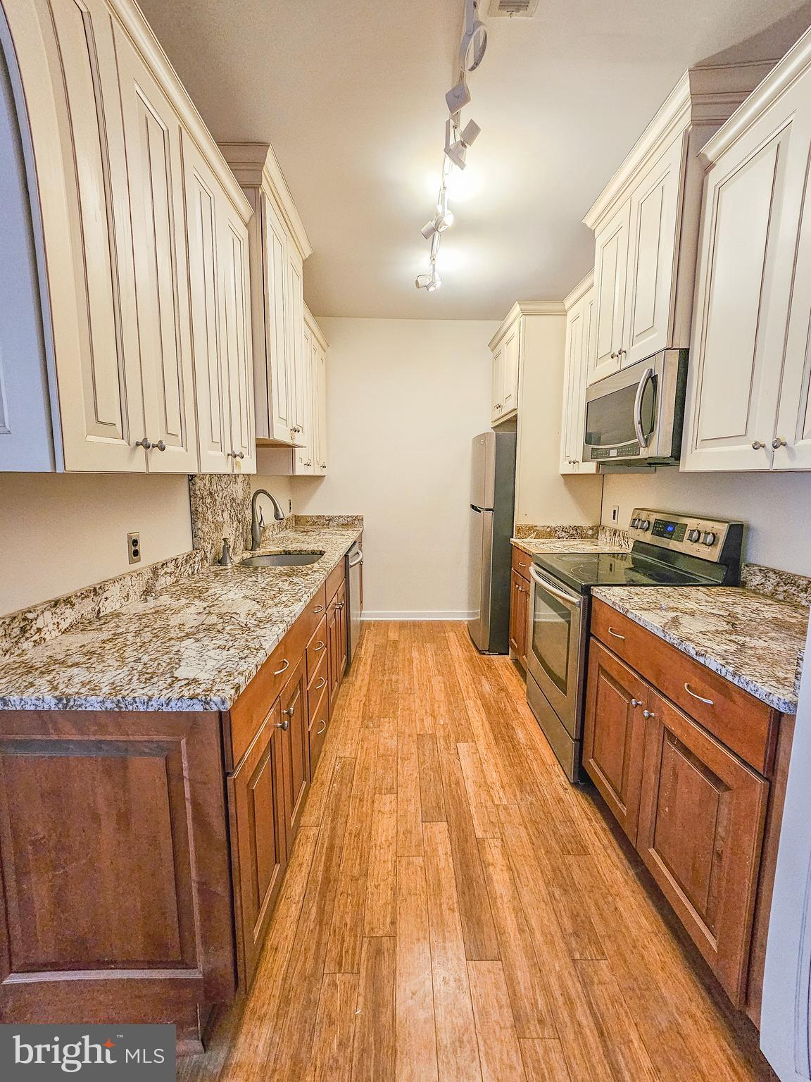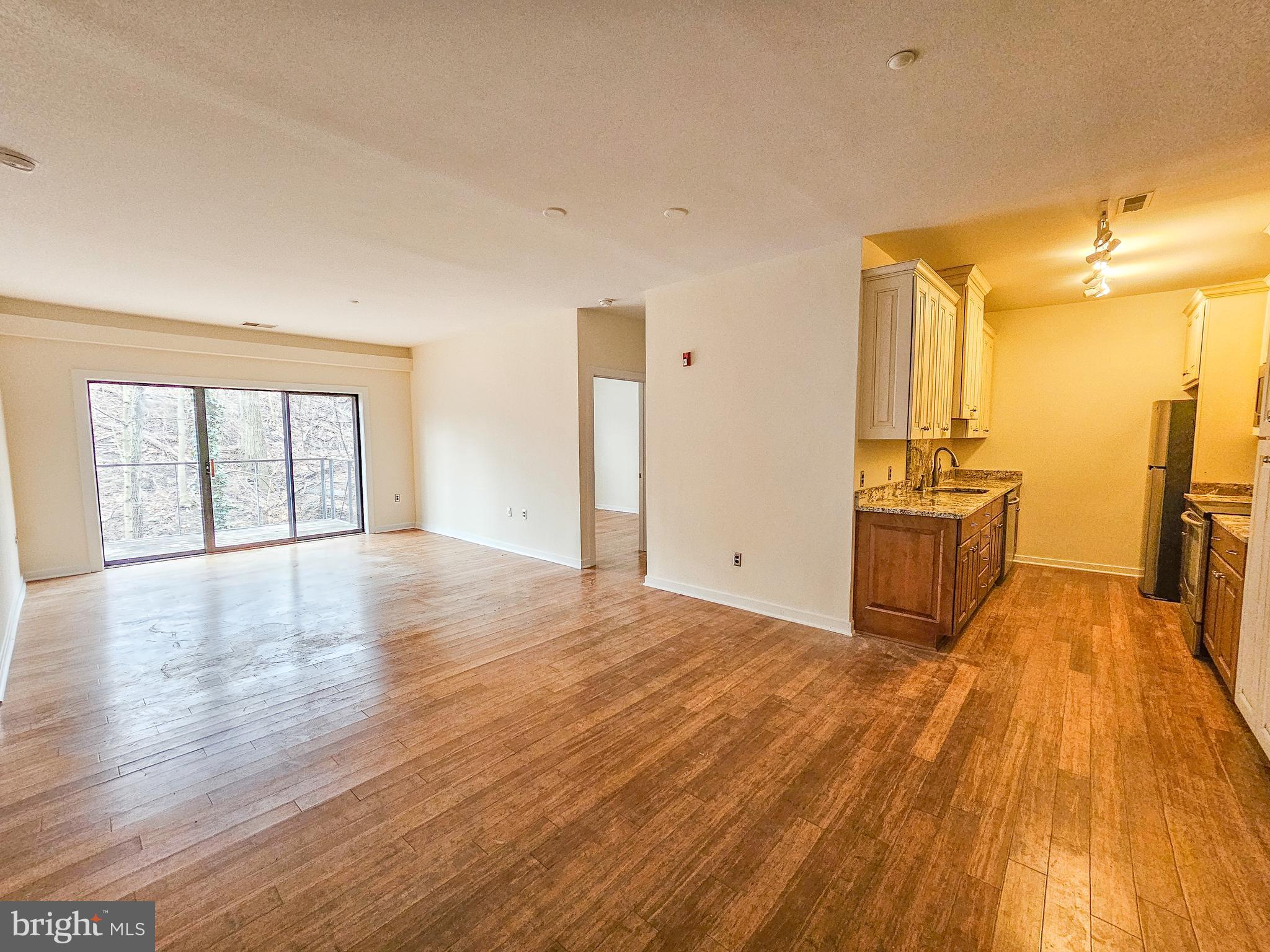 2-bedroom, 2-bath condo in the highly desirable Millrace Condominium features a tranquil balcony overlooking nature and comes with deeded garage parking. The open-concept living and dining area flows into a modern kitchen with granite countertops, while the primary suite boasts a walk-in closet and en-suite bath. Additional highlights include wood floors throughout, a stackable washer and dryer in the utility closet, a fully tuned-up HVAC system, and fresh paint throughout. Plus, enjoy exclusive membership to the Clipper Mill pool!