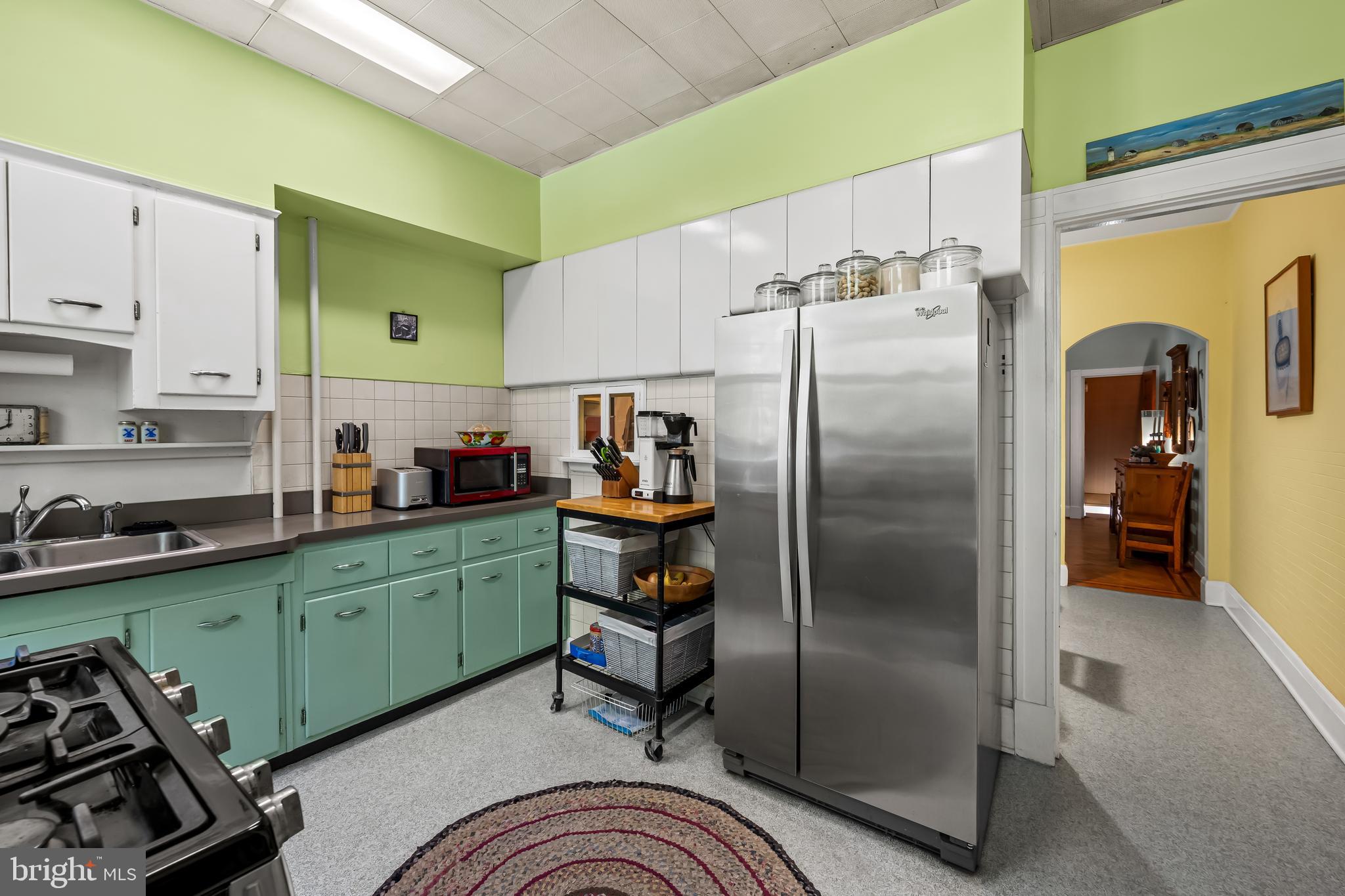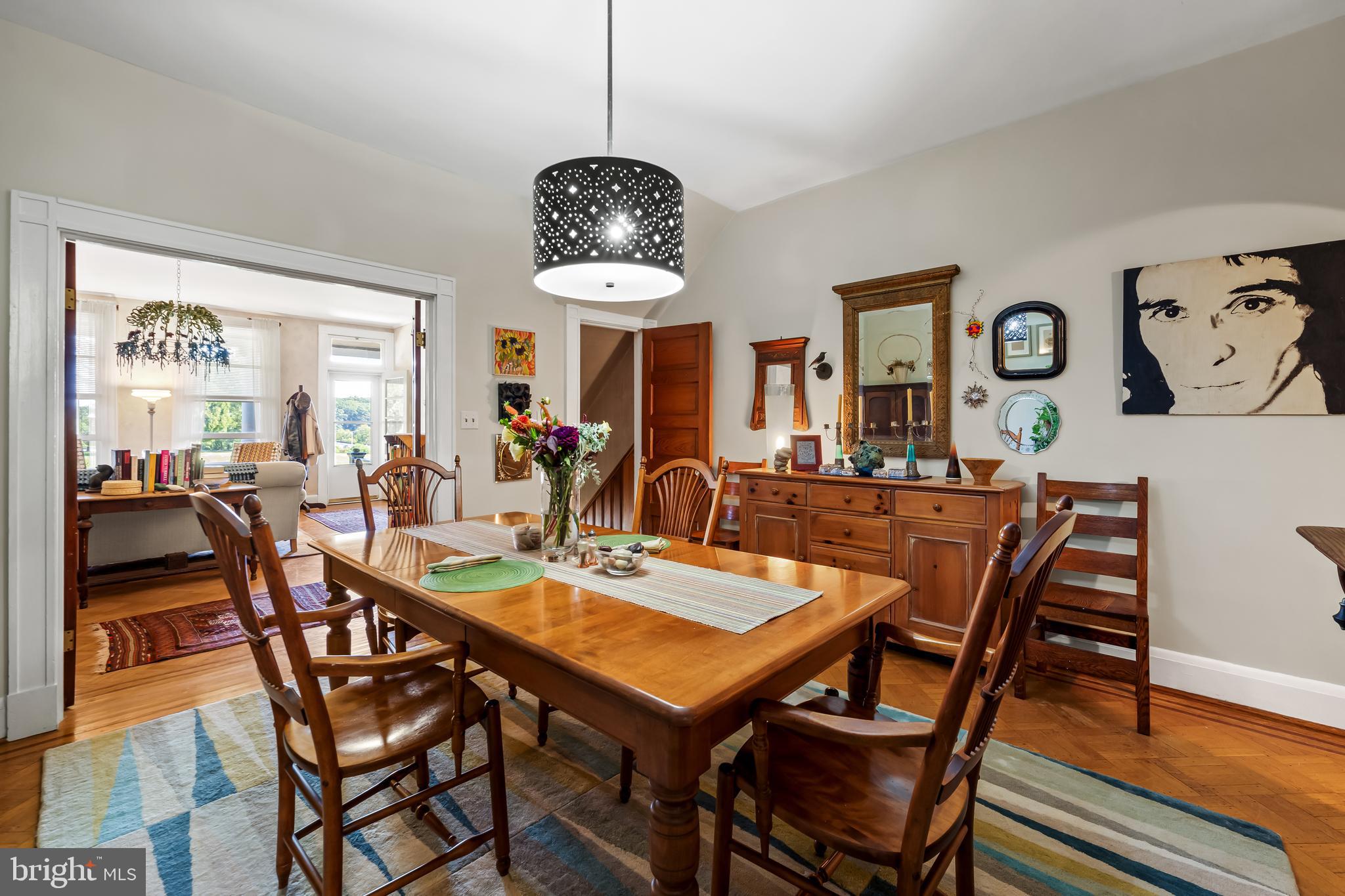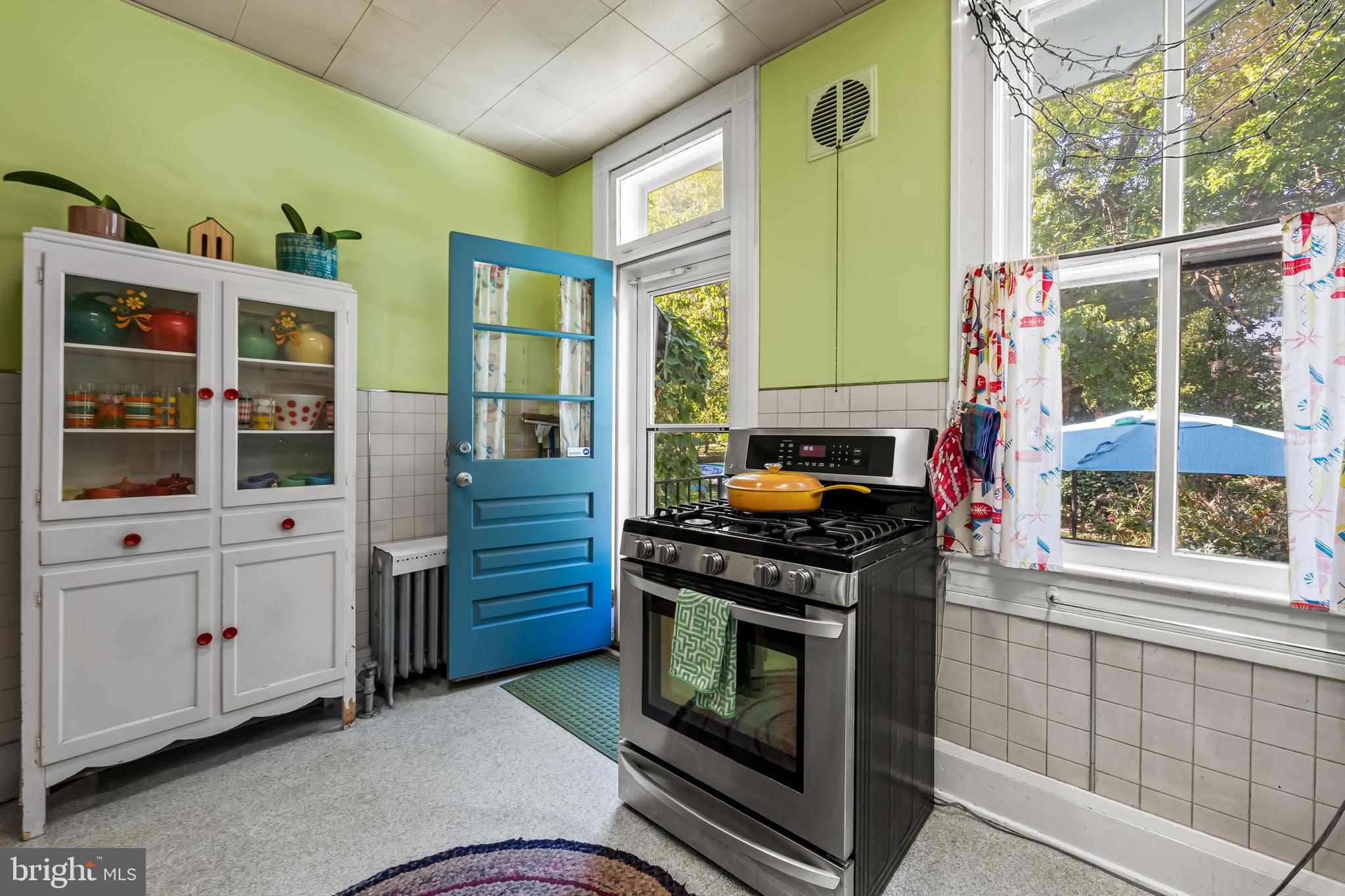 Enjoy sweeping views from your sweet front porch. As you enter the house there is a lovely living room with a gorgeous original mantel with enameled tile, original parquet floors, French doors, a spacious dining room, a breakfast room, and an intentionally retro kitchen overlooking a lush garden. Think Mint Green Lecruset, vintage tea towels, and red and white check aprons.