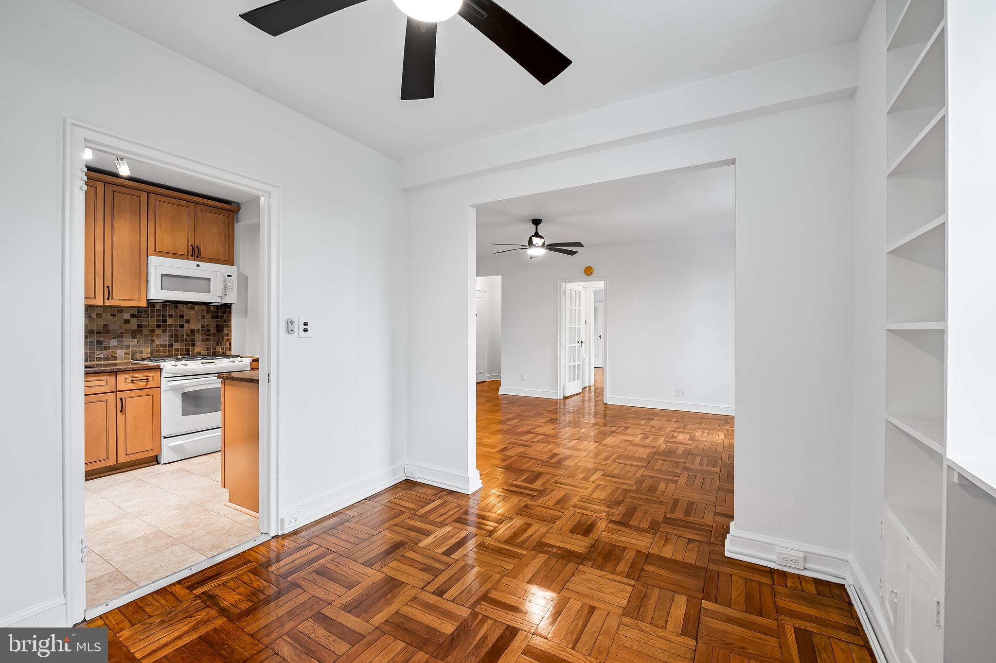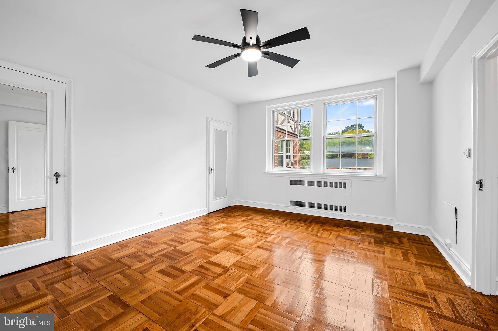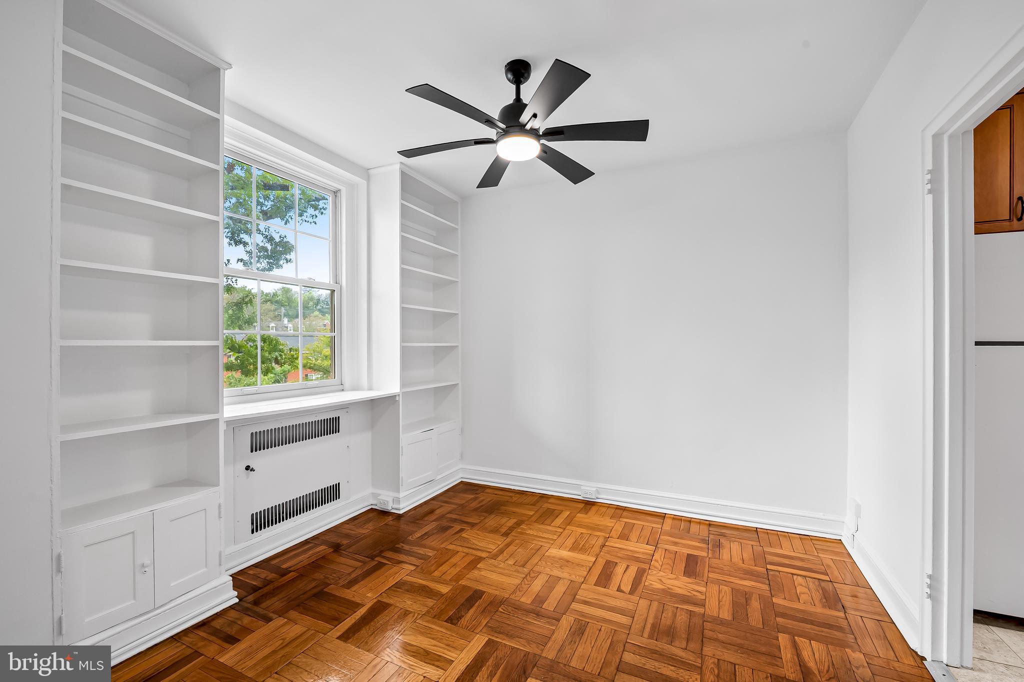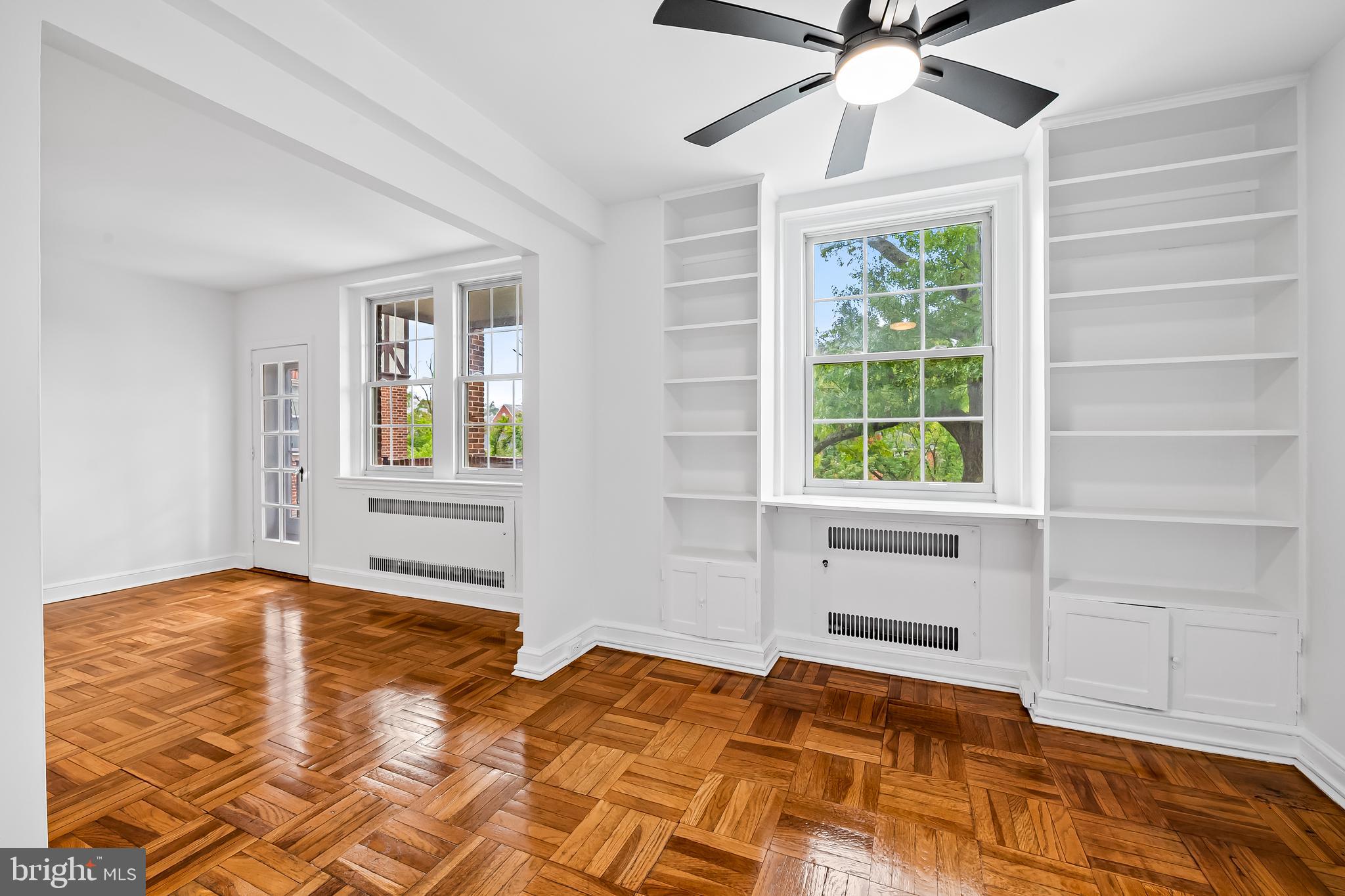 Located on the entrance level of the building, this unit requires no stairs or elevator--ideal for those who want easy access. Inside, you'll find a welcoming foyer with a large coat closet, a spacious living and dining room with built-ins, a modern kitchen, a generous bedroom with two double closets, and a full bath with the classic black-and-white tile Baltimore is known for. The parquet floors have just been refinished, and the entire unit freshly painted, making it move-in ready.