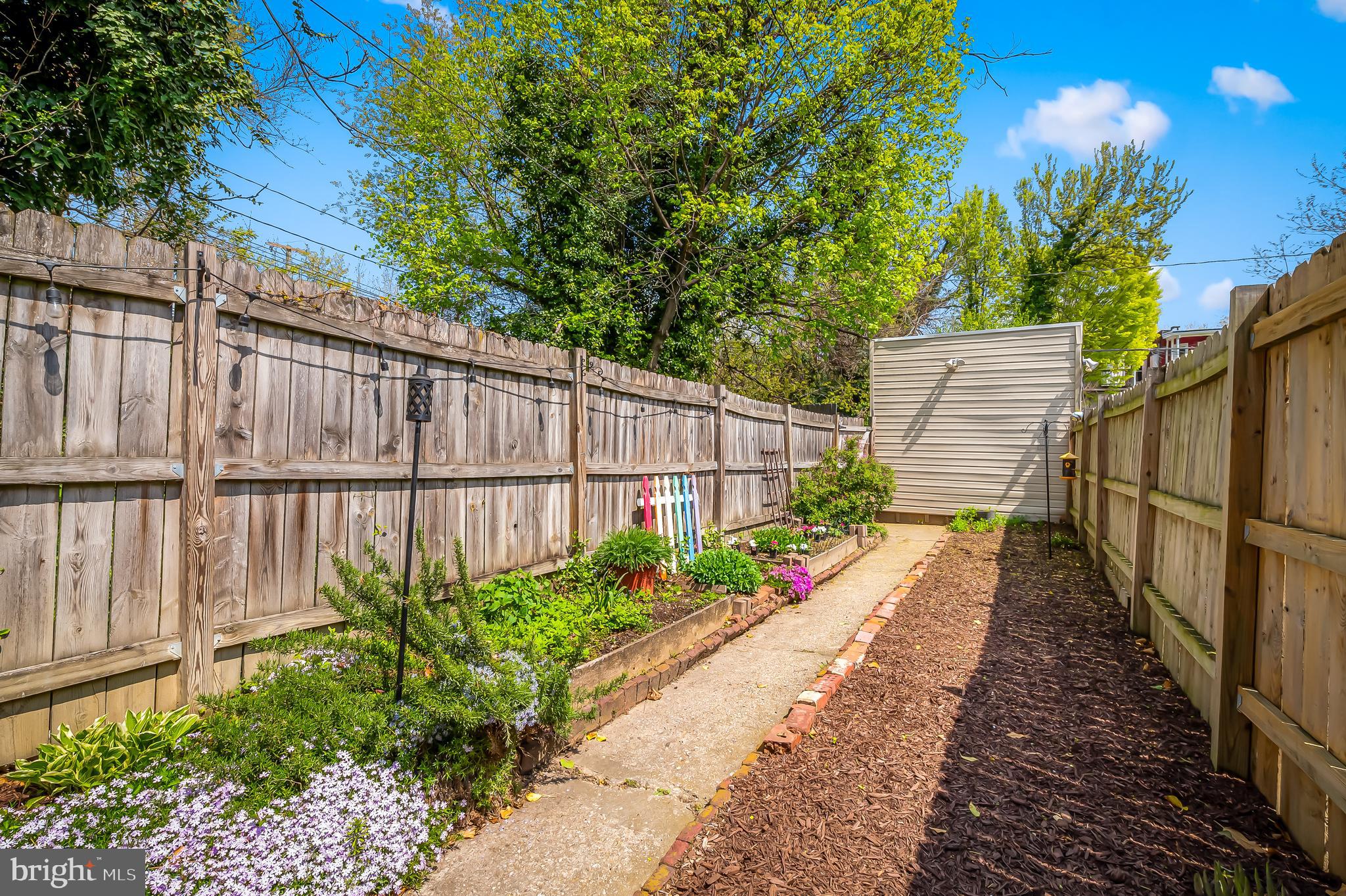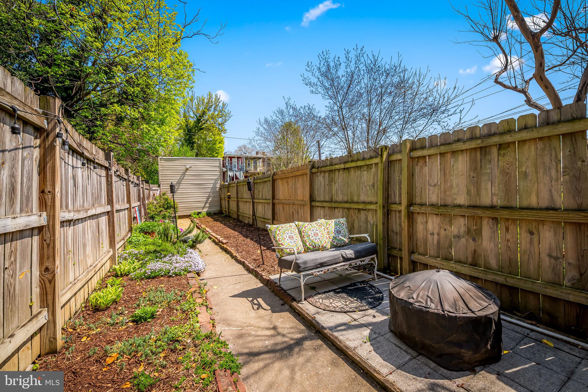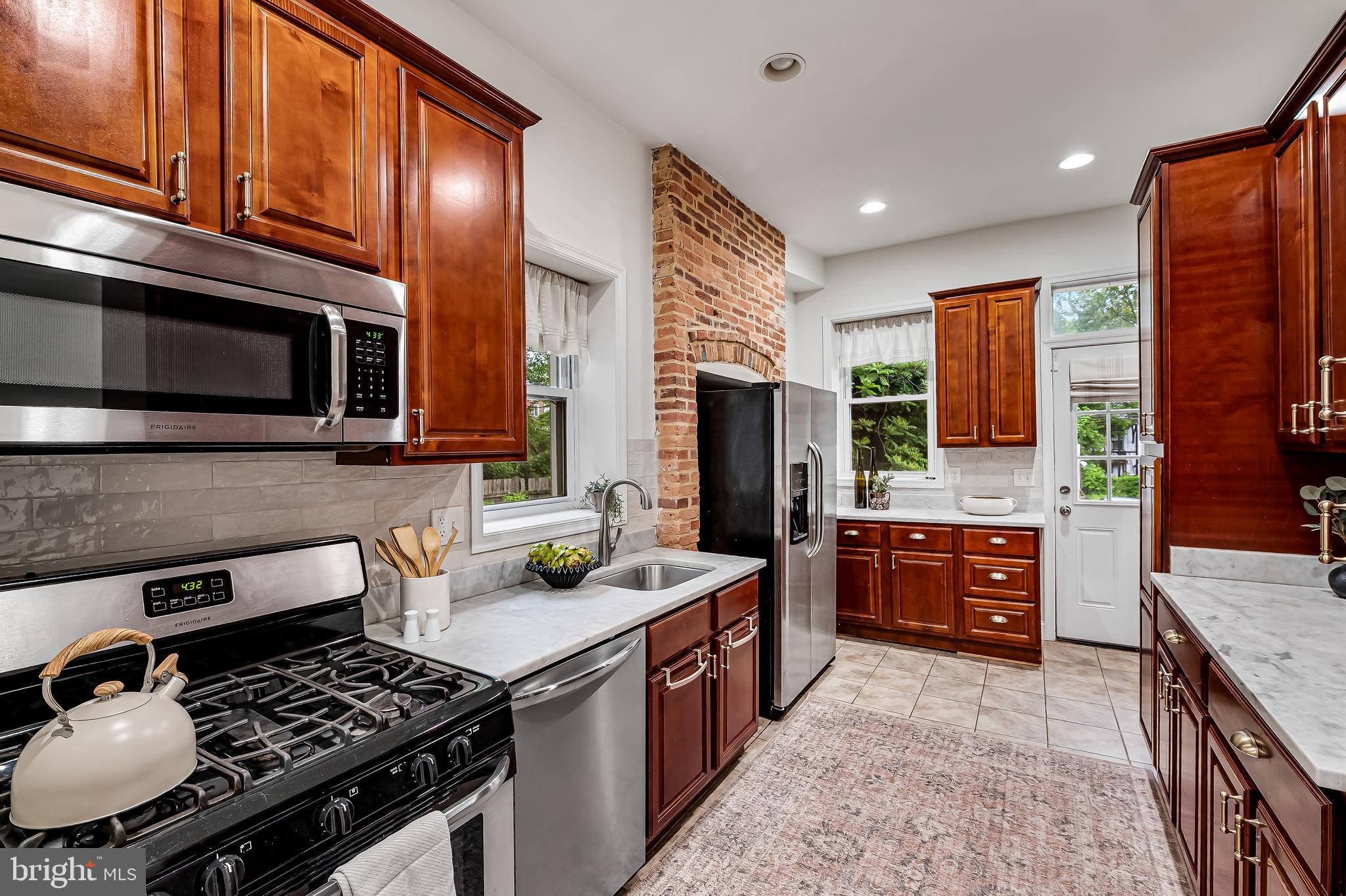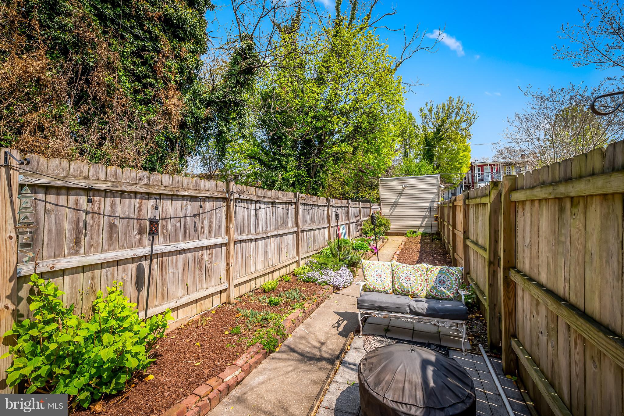 The first floor has a spacious light filled living and dining room with exposed brick hearths, convenient powder room and modern kitchen. The second floor has a spacious primary suite with walk-in closets and luxurious spa bath with double vanity, soaking tub, separate shower and linen closet plus an additional bedroom. The third floor has two generous bedrooms, full bath and a skylight over the stairs which floods the center of the home with natural light. At the back of the house is a large fenced rear yard with deck, raised planting beds and detached garage for your two or four wheeled toys or projects. The garden is thoughtfully planted with colorful perennials that will bloom year after year.