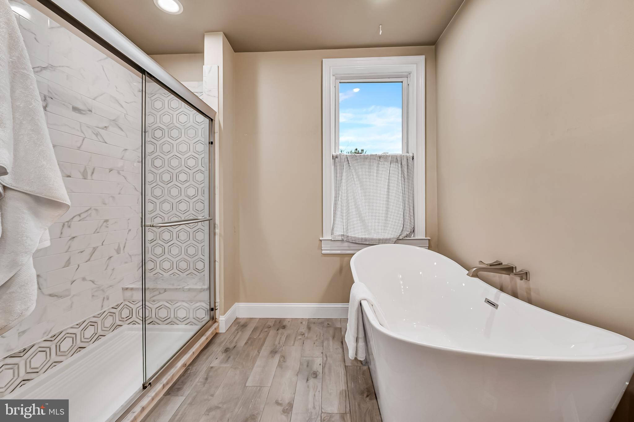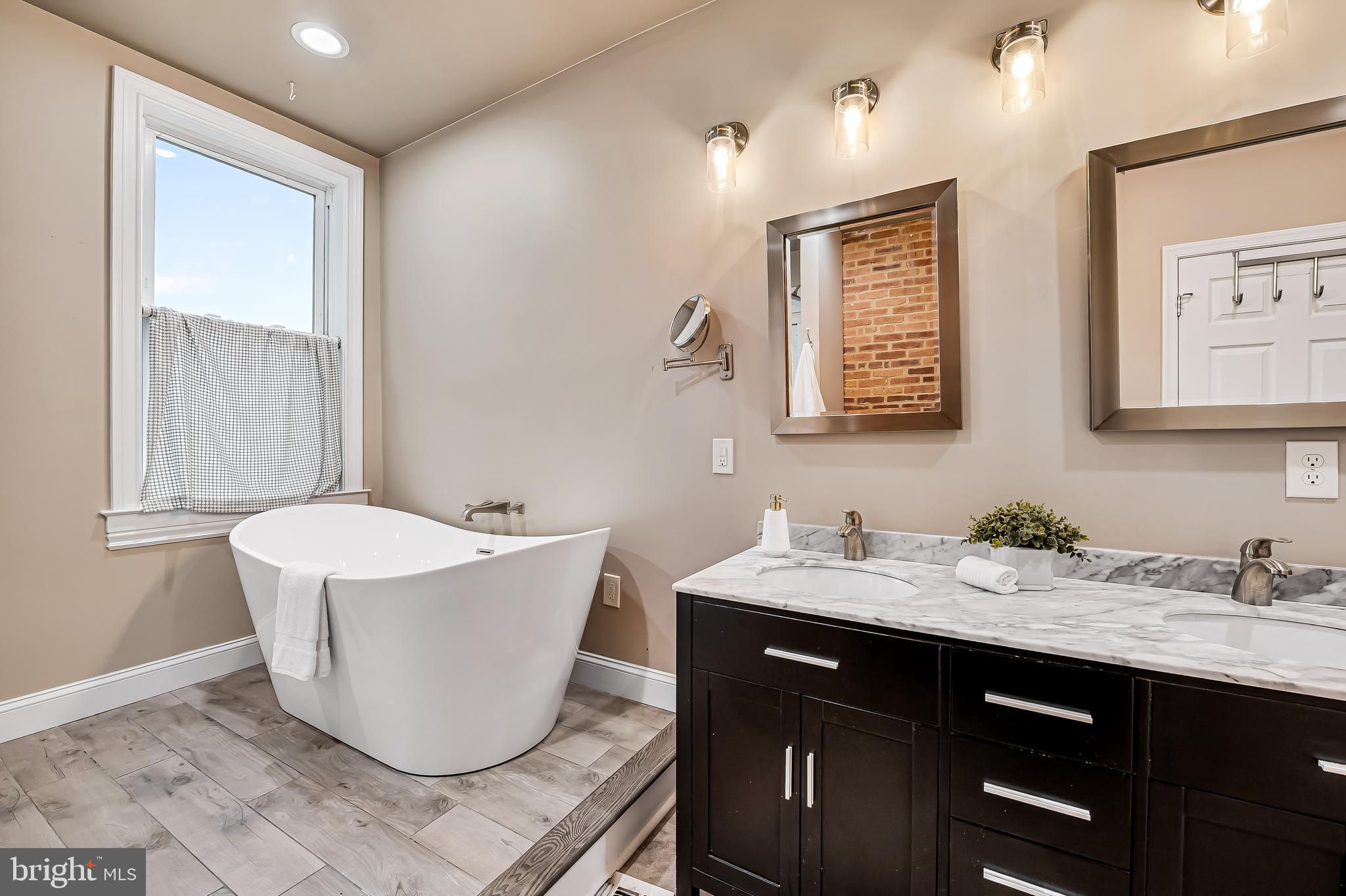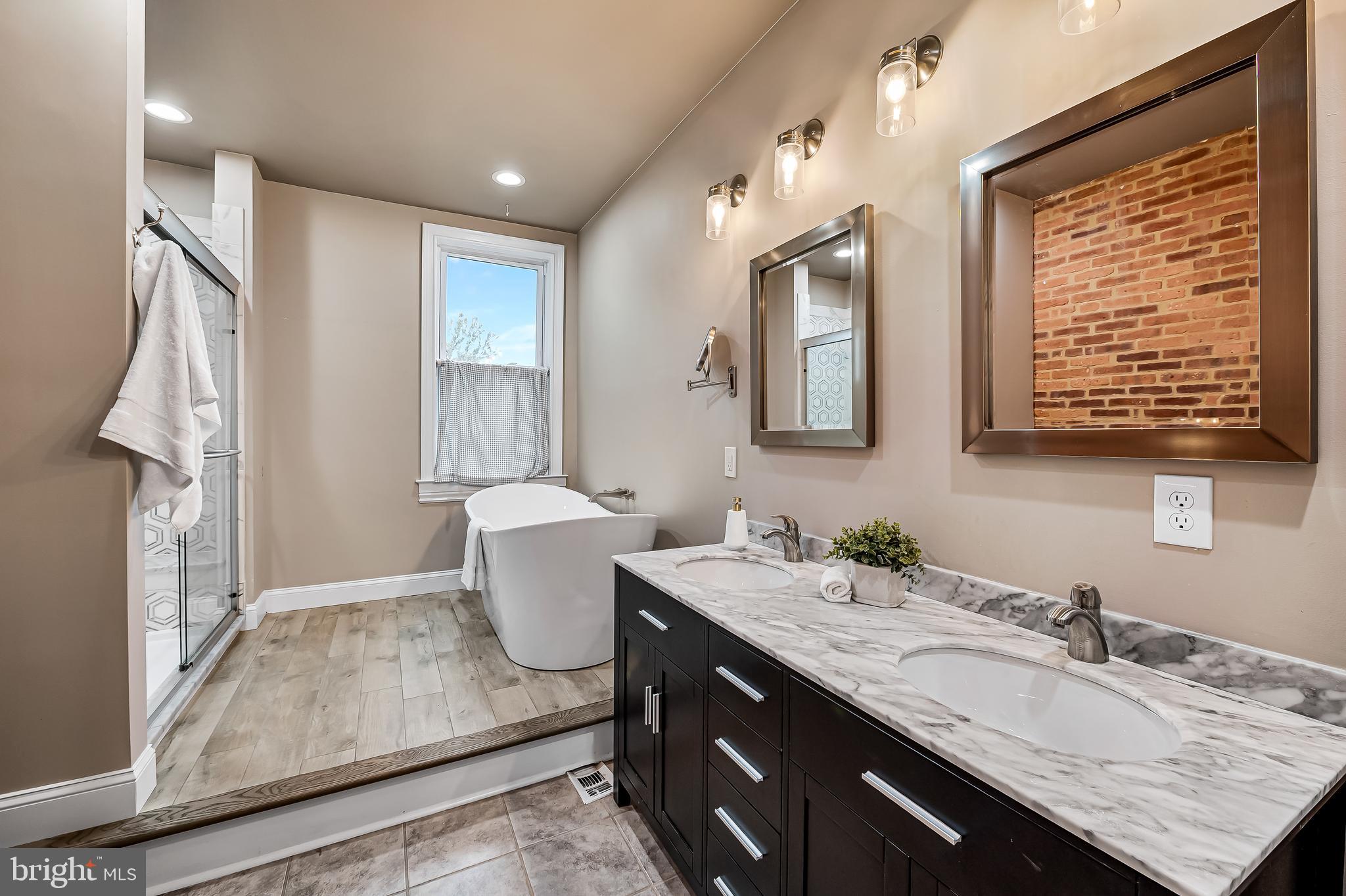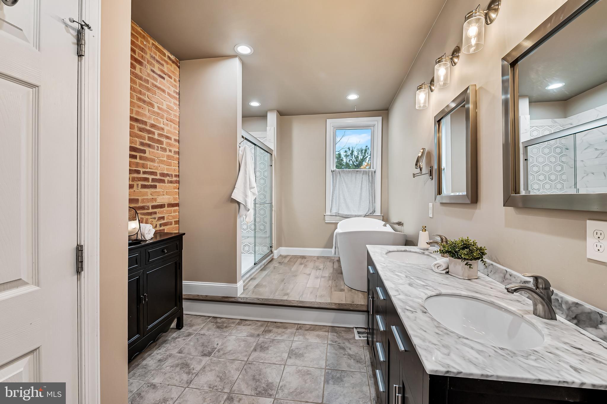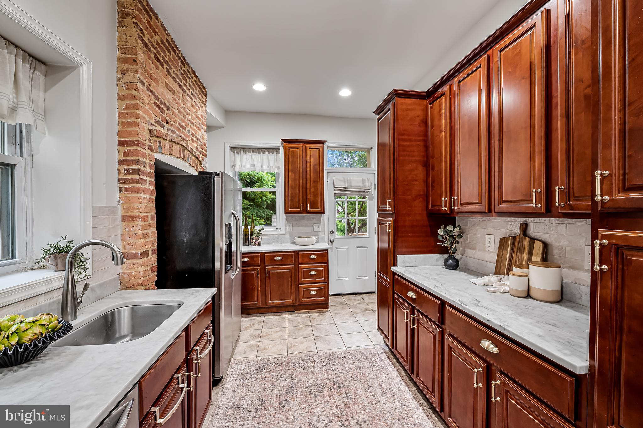 The first floor has a spacious light filled living and dining room with exposed brick hearths, convenient powder room and modern kitchen. The second floor has a spacious primary suite with walk-in closets and luxurious spa bath with double vanity, soaking tub, separate shower and linen closet plus an additional bedroom. The third floor has two generous bedrooms, full bath and a skylight over the stairs which floods the center of the home with natural light. At the back of the house is a large fenced rear yard with deck, raised planting beds and detached garage for your two or four wheeled toys or projects. The garden is thoughtfully planted with colorful perennials that will bloom year after year.