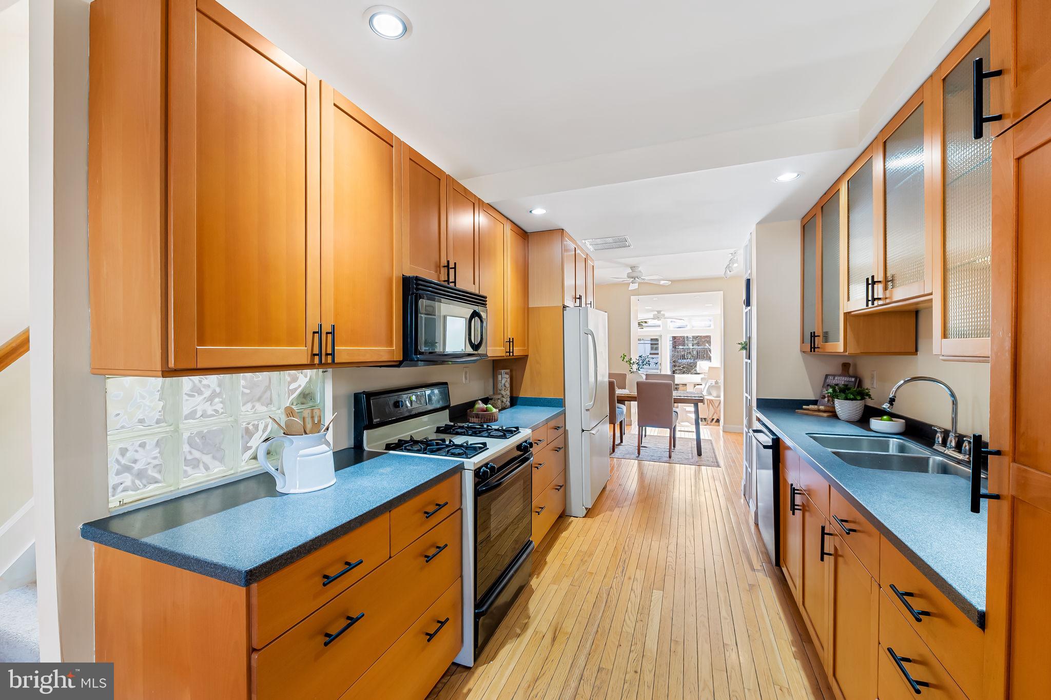 The galley kitchen opens up to a dining room, powder room and a more expansive family room addition, perfect for watching TV and entertaining guests. A dedicated home office provides a quiet space for work or study. Outside, enjoy the privacy of your own fenced yard, ideal for relaxation or hosting gatherings.