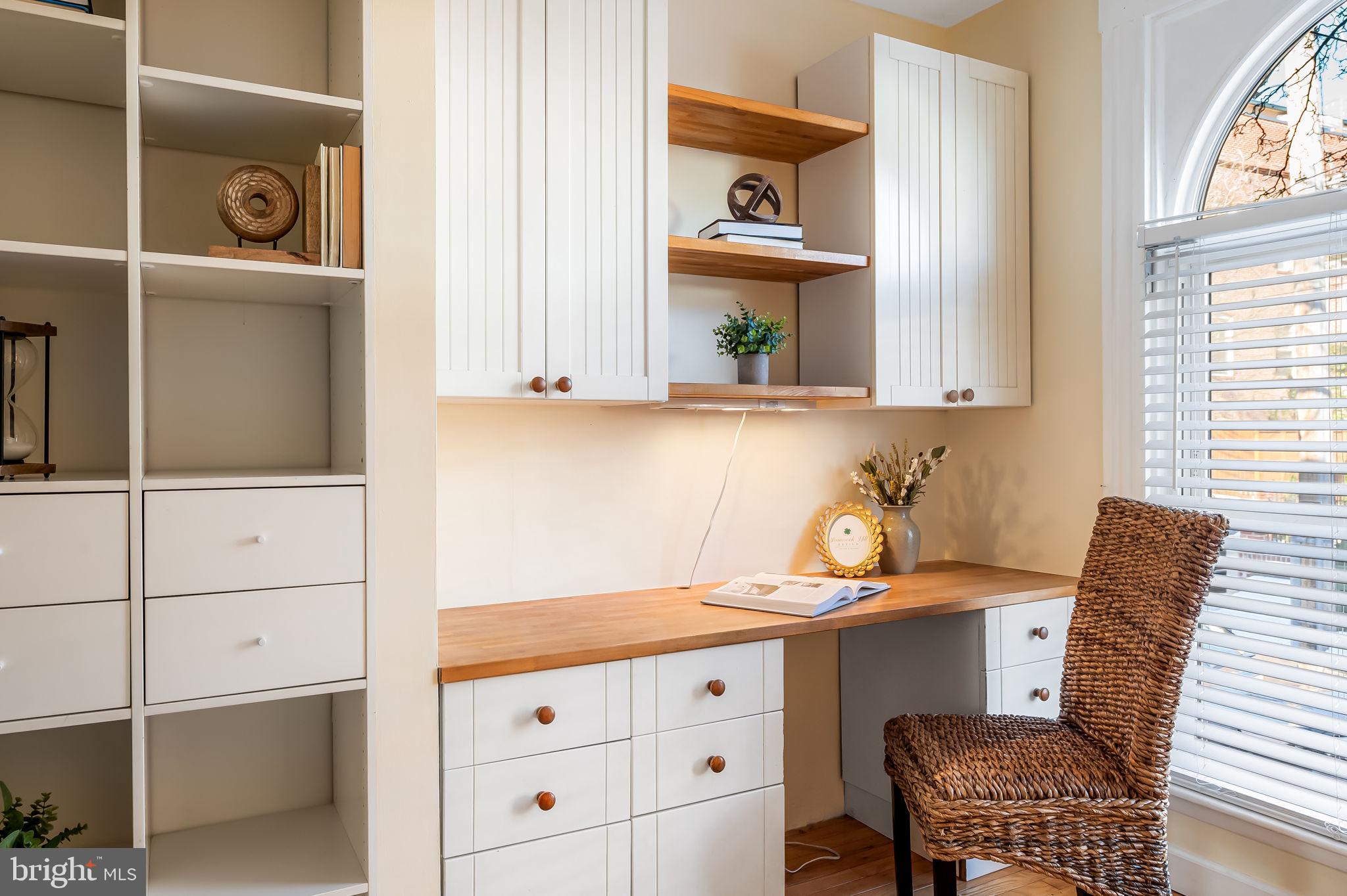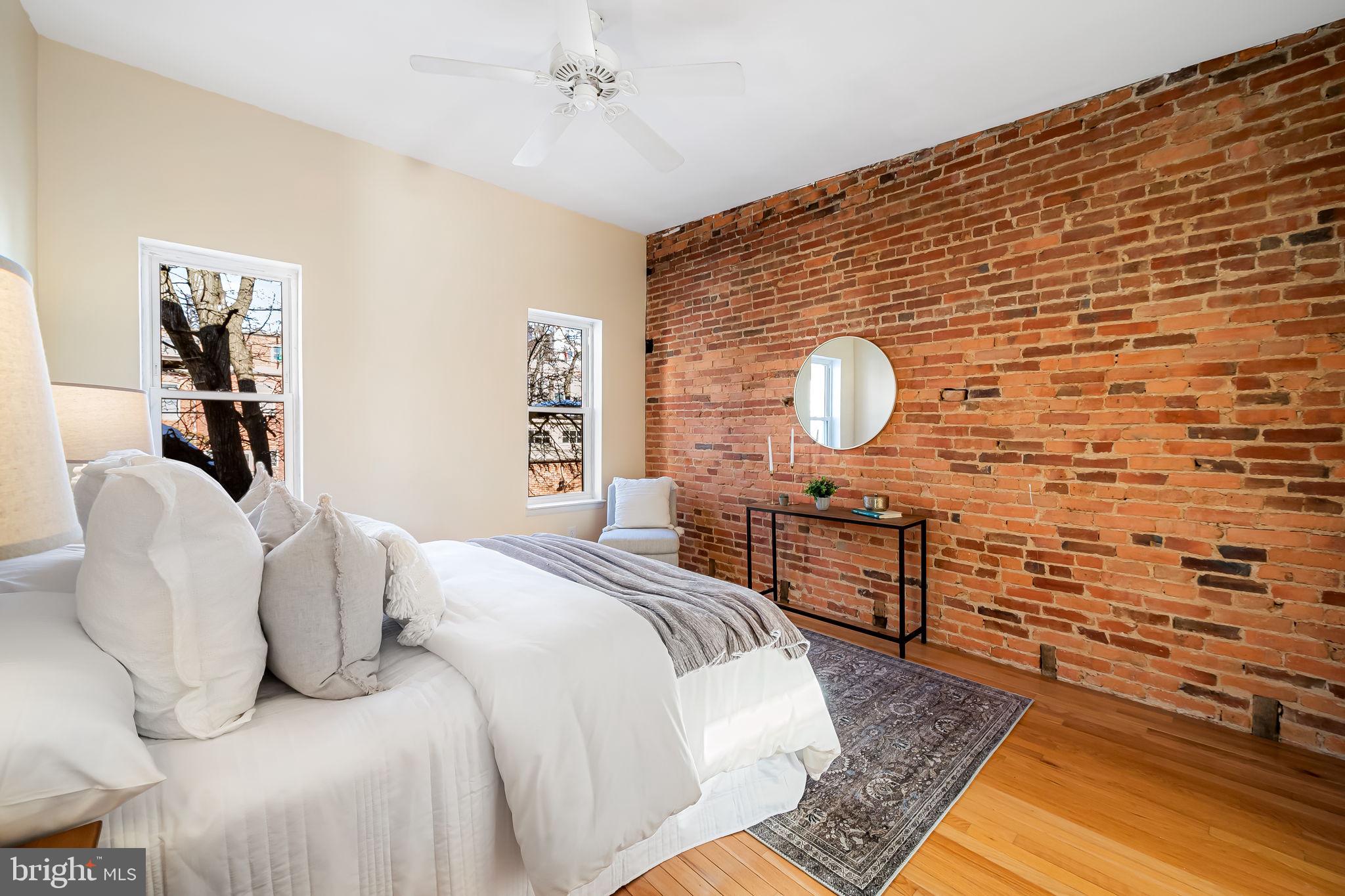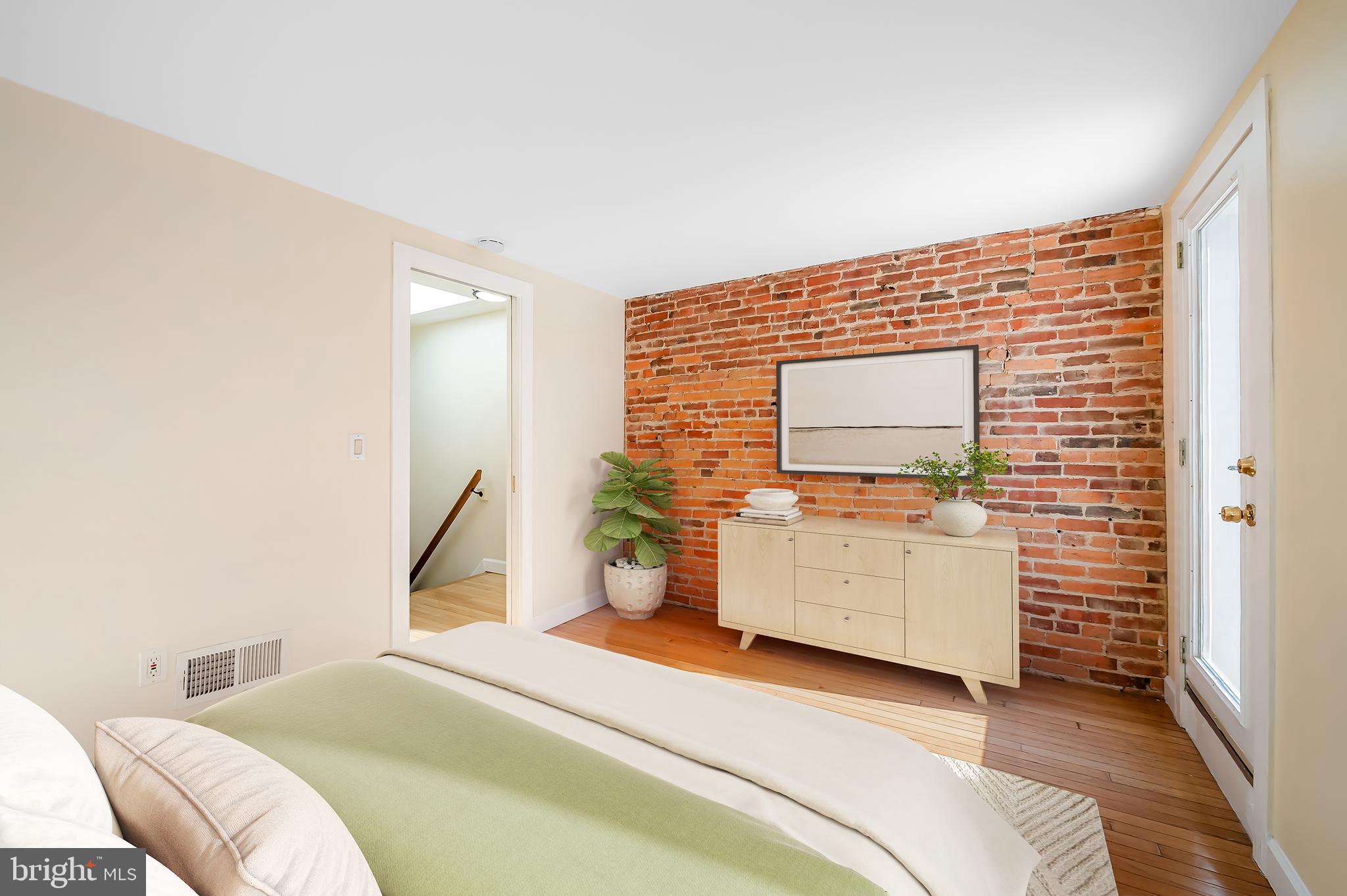 Step through the beautiful stained glass front door with custom transom to discover the unique architectural elements that set this home apart, including built-in shelving, hardwood flooring, and exposed brick that add character and warmth. The northern and southern exposures fill the home with natural light, enhanced by recessed lighting and a large skylight to brighten the interior.
