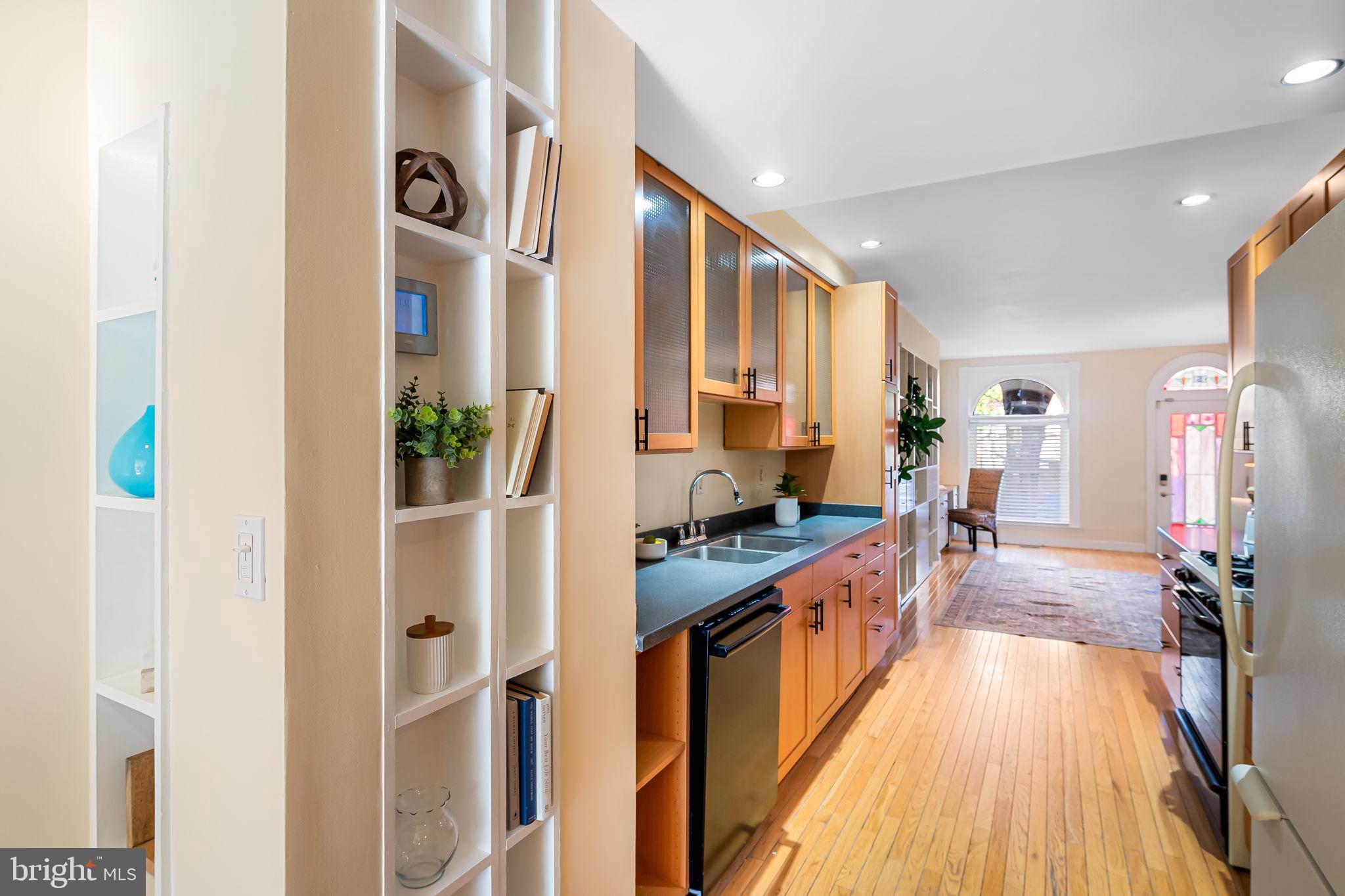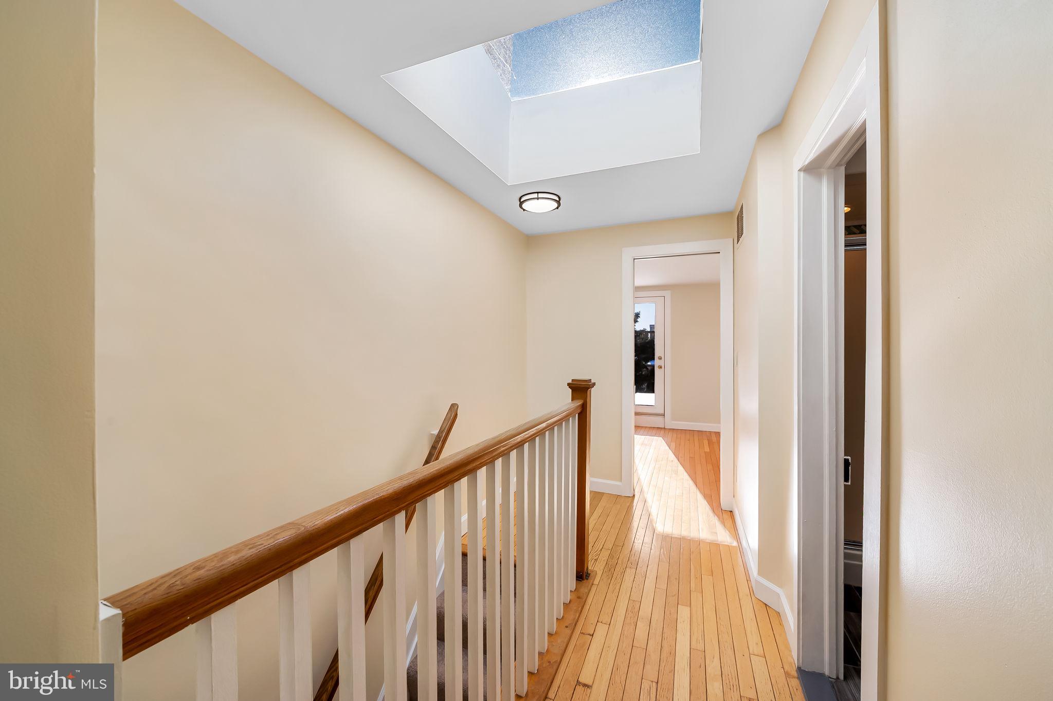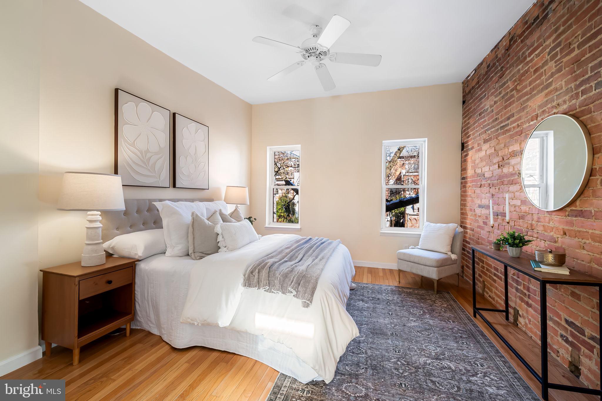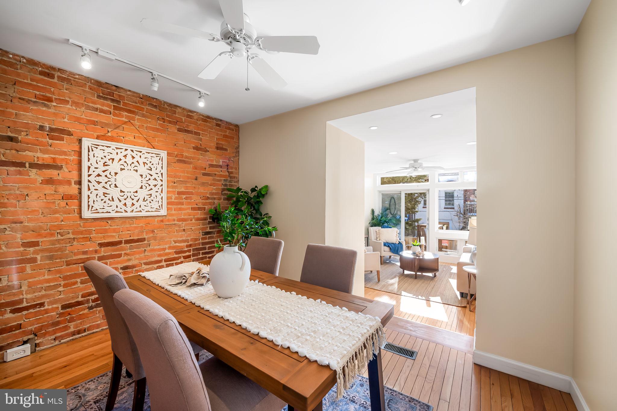 Step through the beautiful stained glass front door with custom transom to discover the unique architectural elements that set this home apart, including built-in shelving, hardwood flooring, and exposed brick that add character and warmth. The northern and southern exposures fill the home with natural light, enhanced by recessed lighting and a large skylight to brighten the interior.