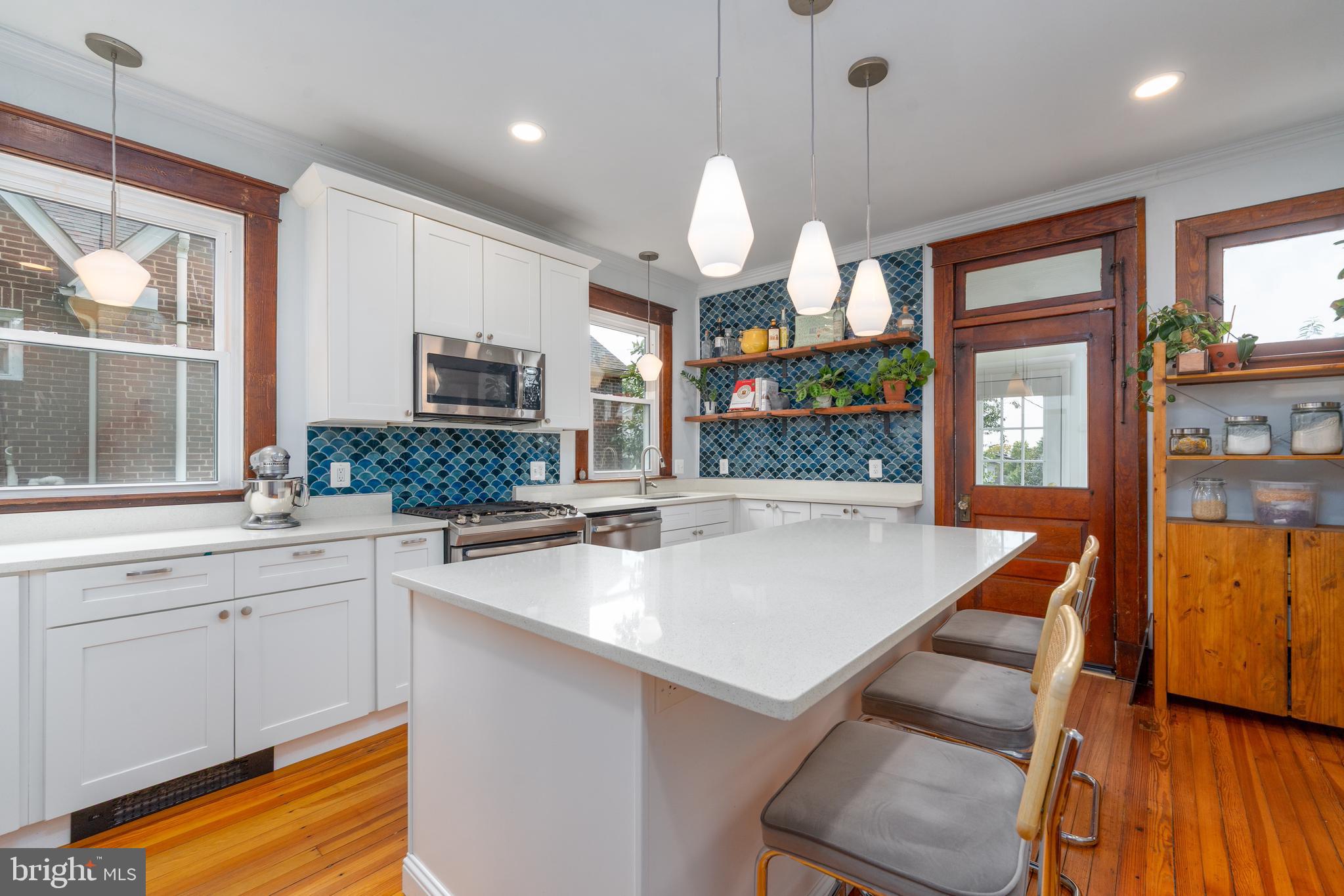 At the heart of the home is the spacious chef's kitchen, designed to be both beautiful and functional. A large center island anchors the room, offering space for prep, cooking, and casual gatherings. Exquisite blue scallop tile adds artistry and personality, while reclaimed wood shelving provides warmth and charm. Abundant cabinetry and a walk-in pantry ensure plenty of storage, making this a kitchen that truly works for everyday living as well as entertaining.