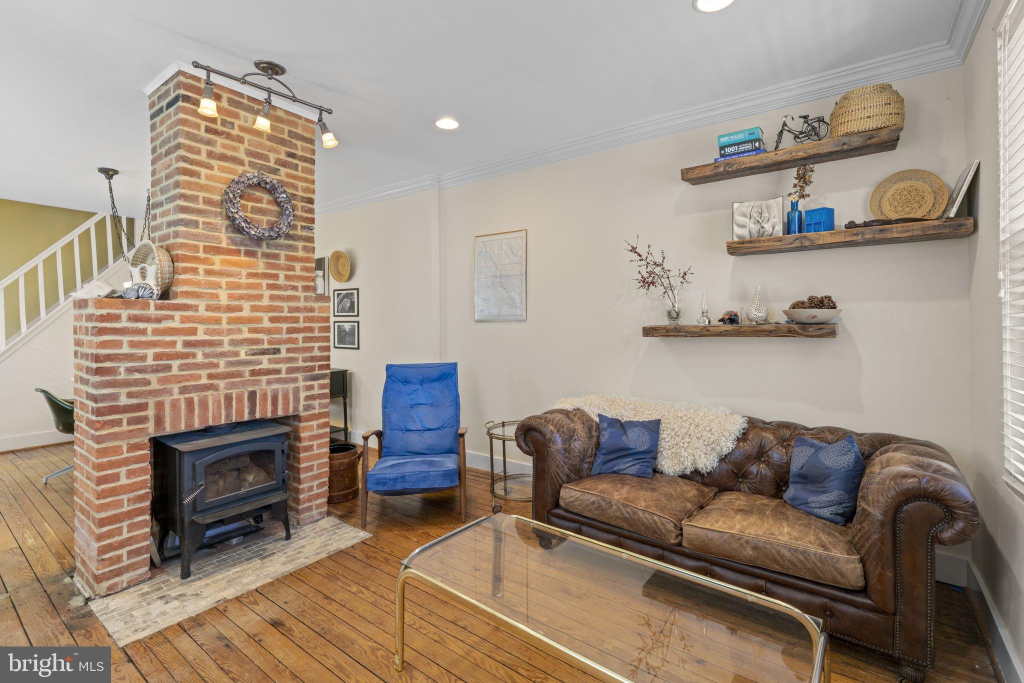 Offer Deadline Sunday March 15th at 2pm. Welcome to 3819 Hickory Avenue in the heart of Hampden! This charming end-of-group home offers 3 bedrooms, 1 full bath, and 1 half bath, blending classic character with thoughtful modern updates. Step into the inviting living room featuring flowing hard pine floors, floating shelves, and a cozy wood-burning stove that adds warmth and ambiance. The spacious dining room provides plenty of room for hosting family dinners or entertaining guests.The gourmet kitchen is equipped with updated appliances, a convenient pantry, and plenty of space to prepare your favorite meals. Just off the kitchen, you'll find a practical mudroom and half bath with heated floors, completing the main level. Upstairs, the charm continues throughout the bedrooms. The primary bedroom is truly a standout, featuring a dramatic cathedral ceiling with exposed brick and beams, creating a warm and unique retreat. The full bathroom offers heated terrazzo floors and elegant Brizo fixtures, adding a touch of luxury. Love to entertain? Step outside to the beautiful patio finished with marble tile and surrounded by landscaped native plants--a perfect outdoor oasis for relaxing or gathering with friends. Additional highlights include a large parking pad with extra room for storage, a rare and valuable feature in the neighborhood.This Hampden gem perfectly combines historic charm, modern comforts, and fantastic outdoor space.