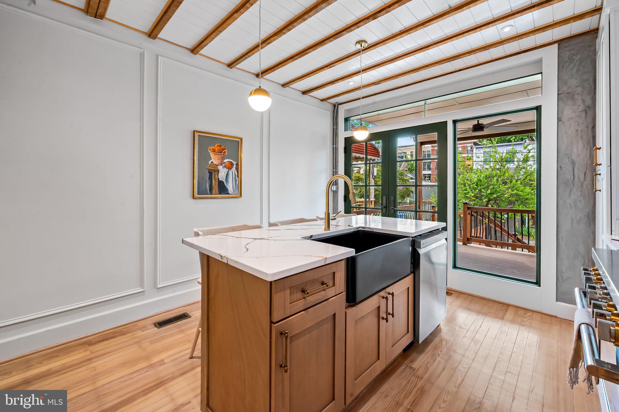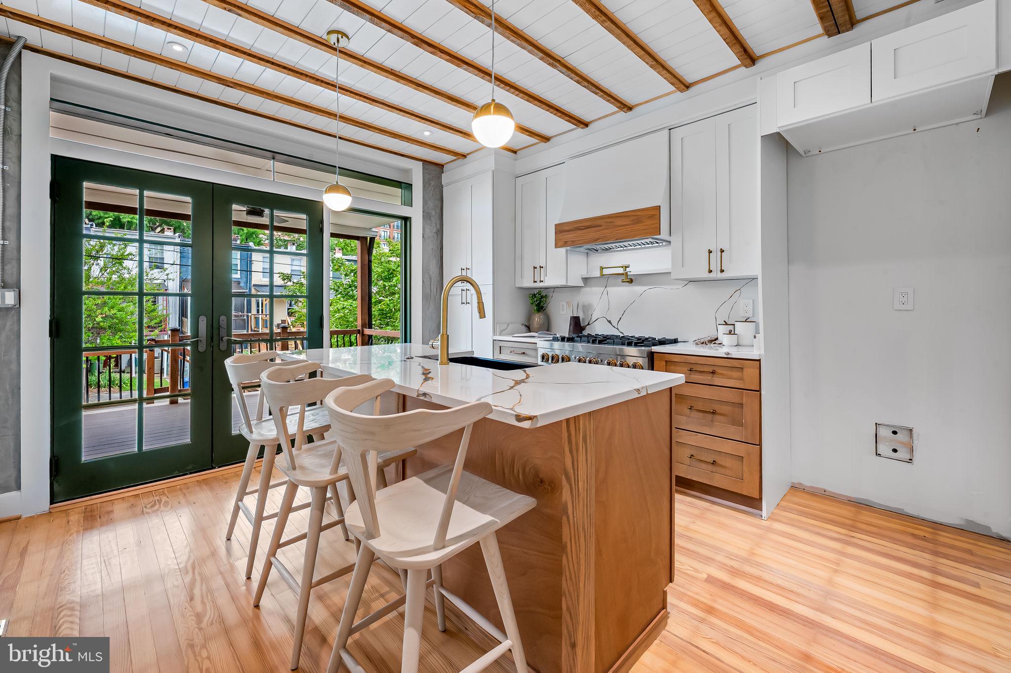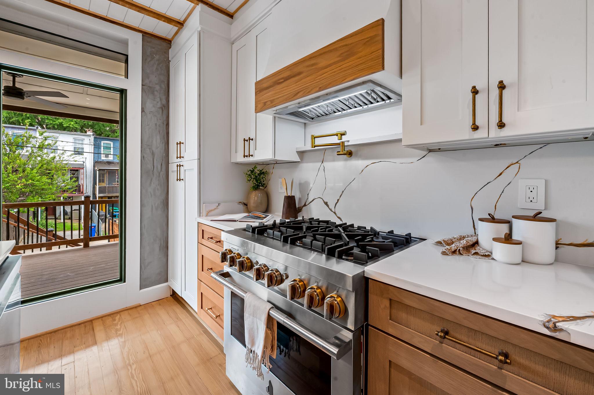 Inside, original refinished wood floors flow throughout. The open living and dining areas offer a thoughtful partial separation for flexible furniture placement. The gourmet kitchen will inspire your inner chef, with a GE Monogram professional-grade gas range, large pantry, coffee station, cookbook nook, and spacious center island. The entire back wall has been replaced with dramatic glass doors that open to a private deck off the kitchen with direct access to the backyard and parking pad. A special powder room features exquisite fixtures and finishes.