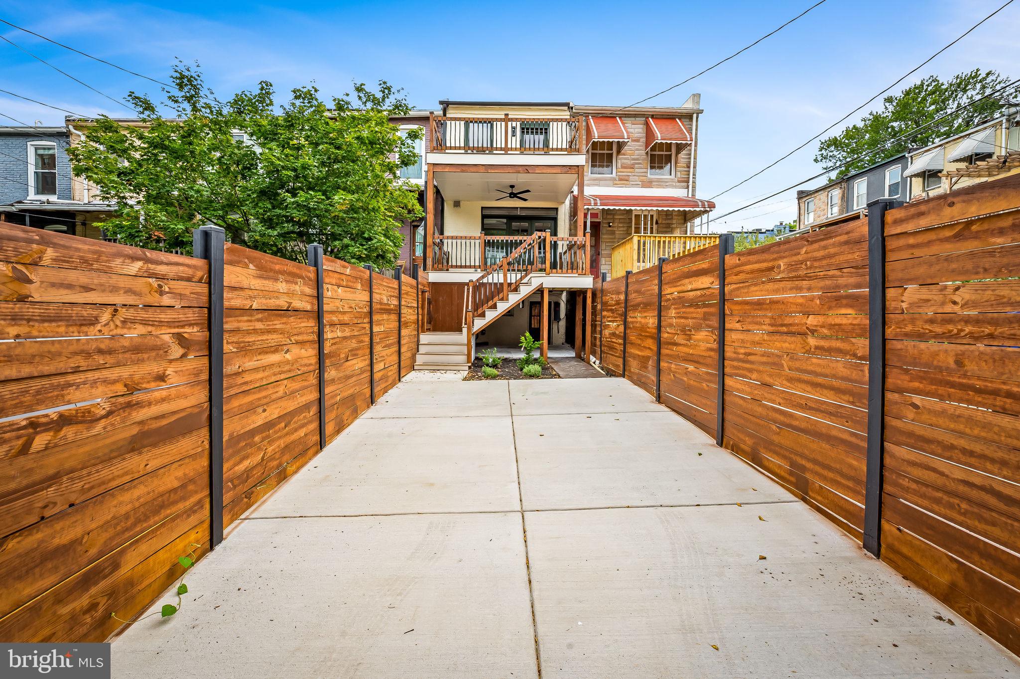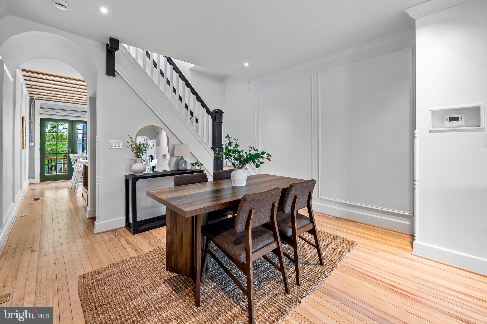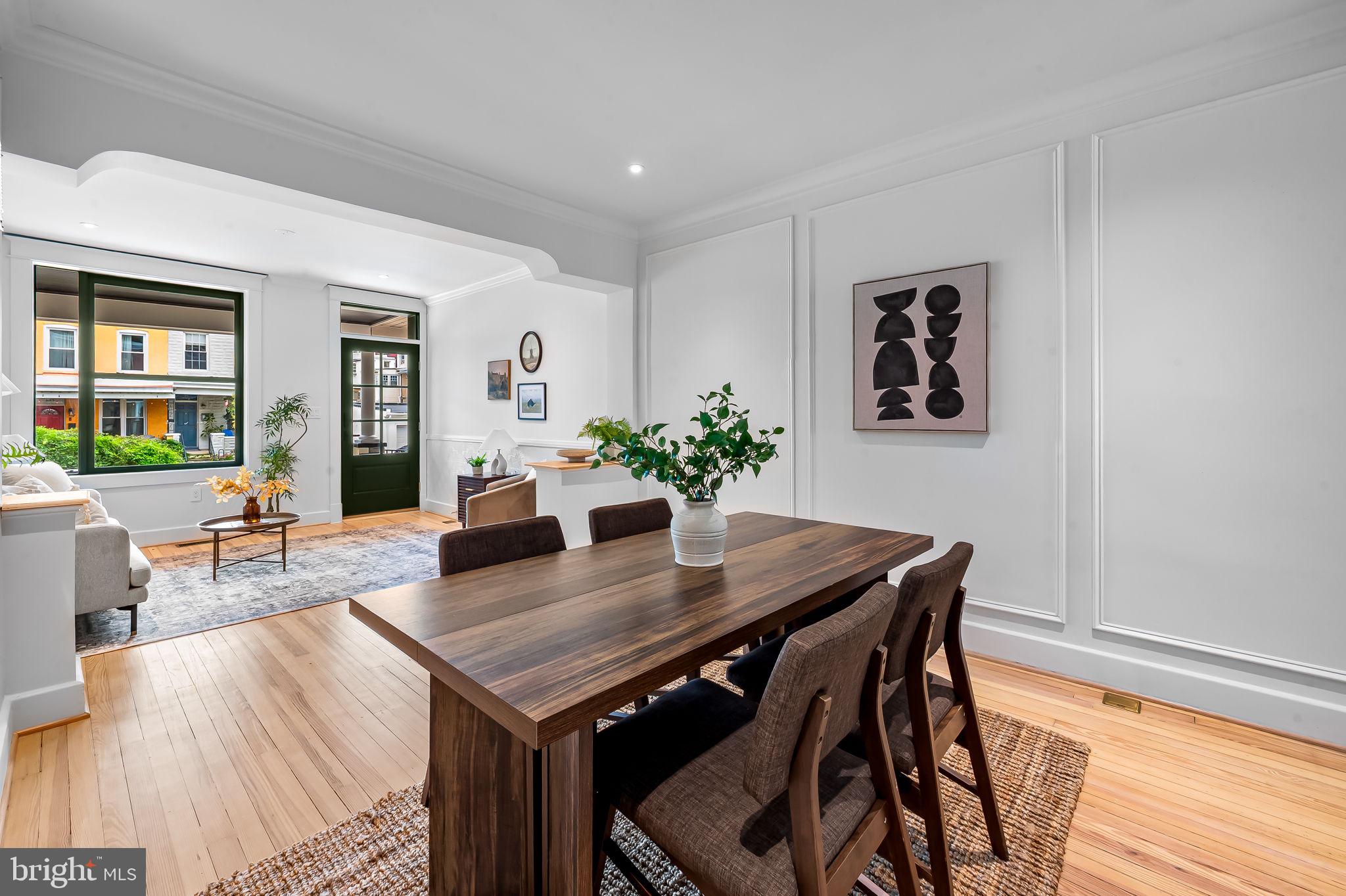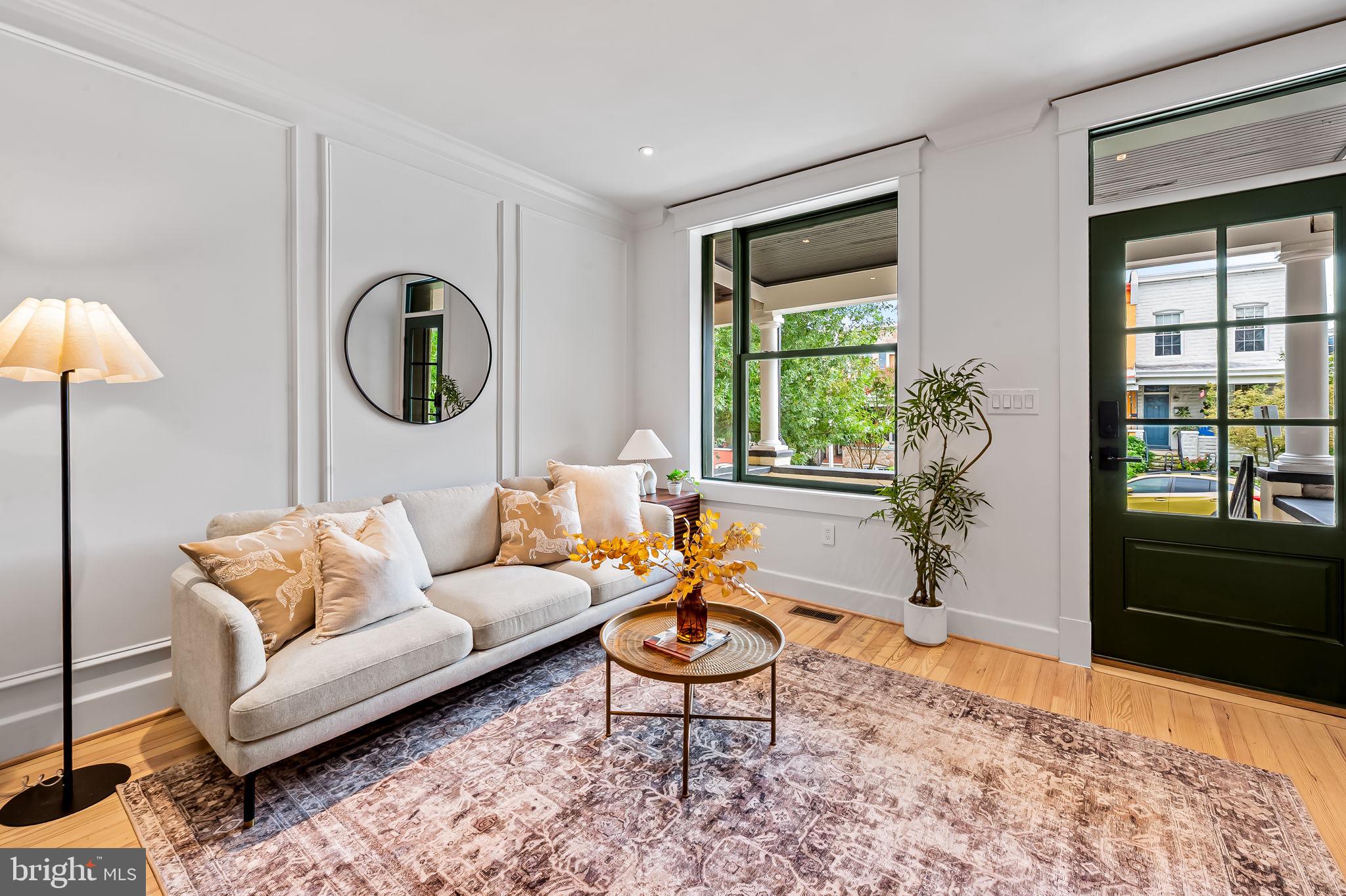 Inside, original refinished wood floors flow throughout. The open living and dining areas offer a thoughtful partial separation for flexible furniture placement. The gourmet kitchen will inspire your inner chef, with a GE Monogram professional-grade gas range, large pantry, coffee station, cookbook nook, and spacious center island. The entire back wall has been replaced with dramatic glass doors that open to a private deck off the kitchen with direct access to the backyard and parking pad. A special powder room features exquisite fixtures and finishes.